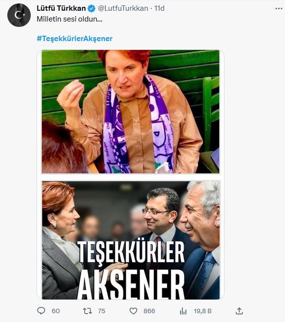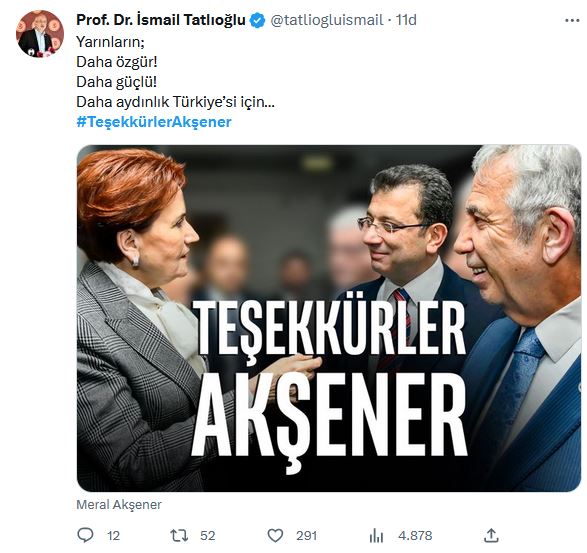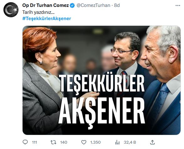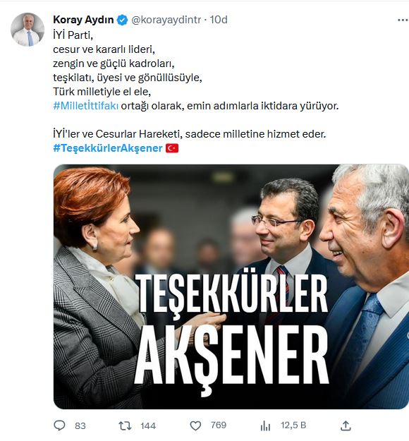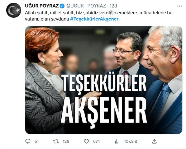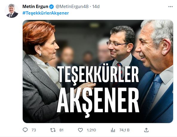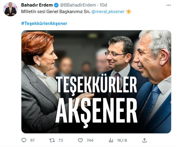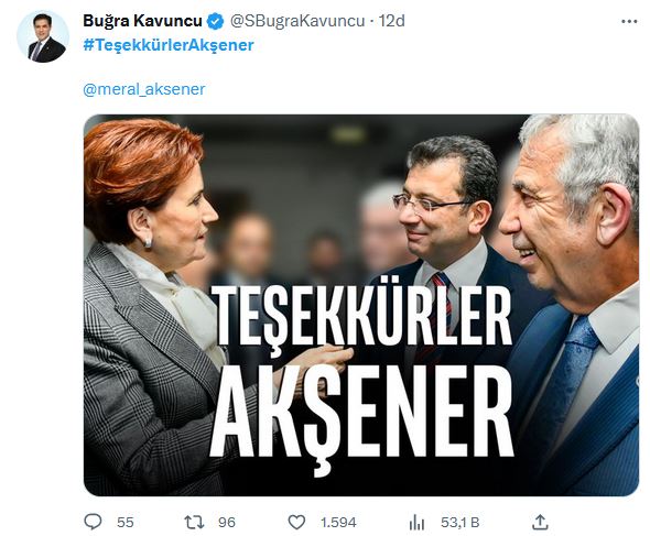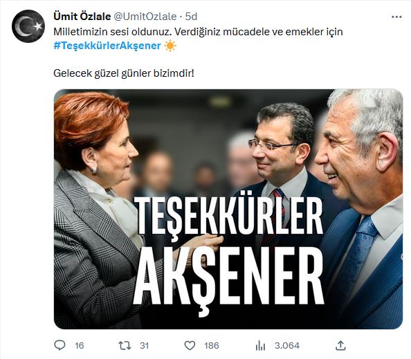 İYİ Partililer Cumhurbaşkanı adayı Kemal Kılıçdaroğlu'nu görmezden gelerek, Mansur Yavaş ve Ekrem İmamoğlu'nun Akşener ile bir arada olduğu "Teşekkürler Akşener" vurgulu görseli tek tek paylaştı.