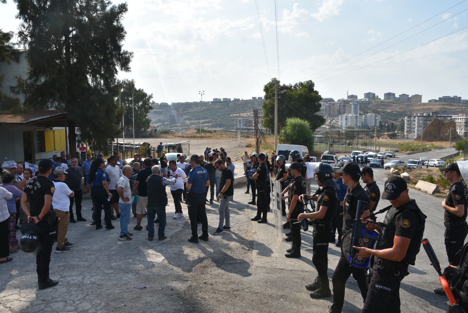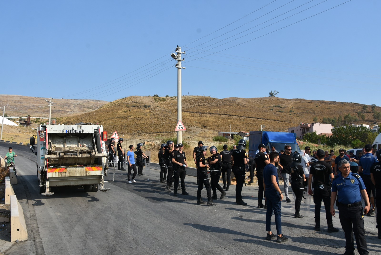 Ardından da çevre güvenliğini alıp çöp kamyonlarının Harmandalı Çöplüğüne geçişine izin verdi. Müdahaleyi protesto eden vatandaşlar geçen çöp kamyonlarını yuhaladı.
