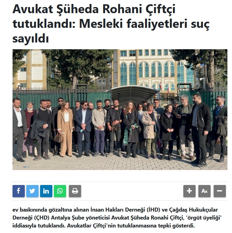 Terör örgütüne üye olmak suçundan tutuklanan avukat Şüheda Ronahi Çiftçi'nin İnsan Hakları Derneği (İHD) ve Çağdaş Hukukçular Derneği (ÇHD) Antalya Şube yöneticisi olduğu ortaya çıktı. Tutuklama kararı sonrasında ise Çiftçi'nin üye olduğu örgütlenmeler tarafından Antalya adliyesi önünde basın açıklaması yapıldığı öğrenildi.