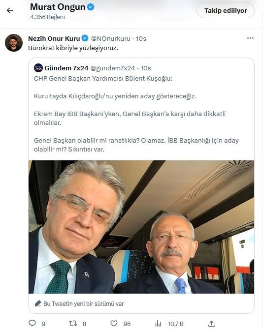 Seçim döneminde aralarında baba-oğul ilişkisi olduğunu söyleyen Kemal Kılıçdaroğlu ve Ekrem İmamoğlu arasında süregelen koltuk krizi giderek büyüyor. Geçtiğimiz gün CHP Genel Başkan Yardımcısı Bülent Kuşoğlu, Kılıçdaroğlu'nu kurultayda yeniden aday göstereceklerini belirtirken İmamoğlu'nun en yakınındaki ismin paylaşımları gündem olmuştu. Sosyal medya bu olay ile çalkalanırken krize bu kez de Kılıçdaroğlu'nun basın danışmanı Deniz Demir dahil oldu.