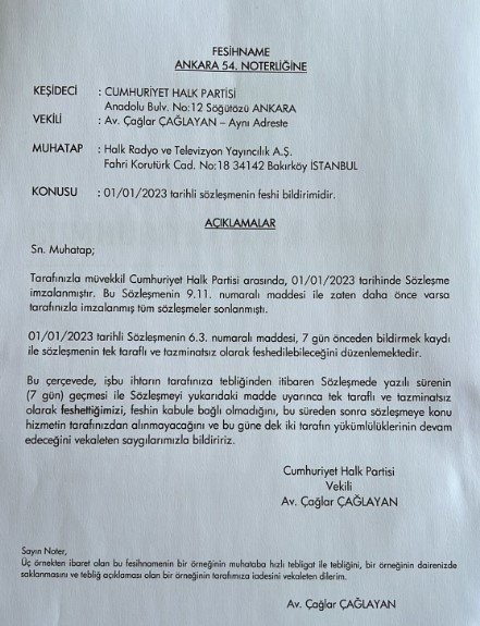 "Halk TV isimli televizyon kanalı ile partimiz arasında yapılmış olan ve Anayasa Mahkemesi ve Sayıştay denetimine tabi 1 Ocak 2023 tarihli protokolün 6.3. maddesi kapsamında, partimiz tek taraflı fesih hakkını kullanmış, Halk TV ile tüm ilişkimiz sona ermiştir."
