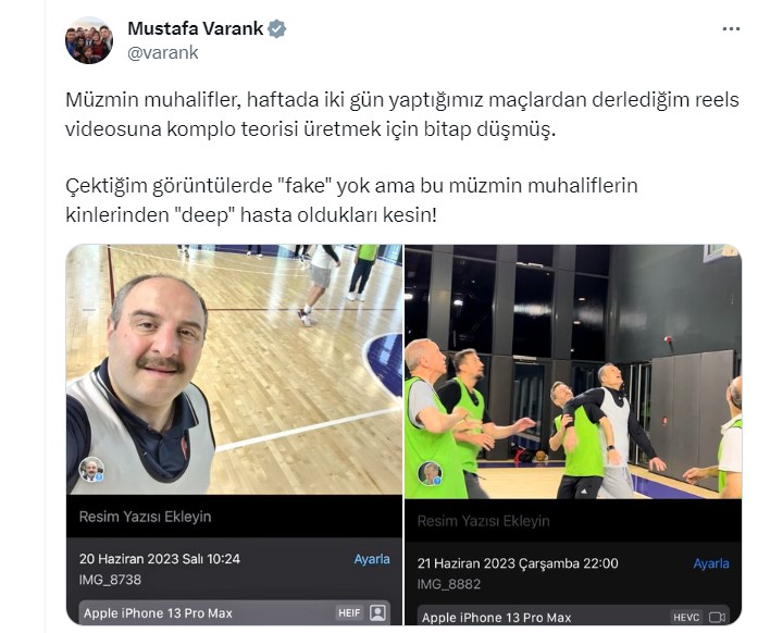 AK Parti Bursa Milletvekili Mustafa Varank Başkan Recep Tayyip Erdoğan'ın basketbol maçı görüntüleri üzerine sosyal medyada başlayan algı operasyonuna cevap verdi. Görüntüleri bir gün arayla çektiğini belirten ve ekran görüntülerini yayınlayan Mustafa Varank, "Çektiğim görüntülerde 'fake' yok ama bu müzmin muhaliflerin kinlerinden 'deep' hasta oldukları kesin!" dedi