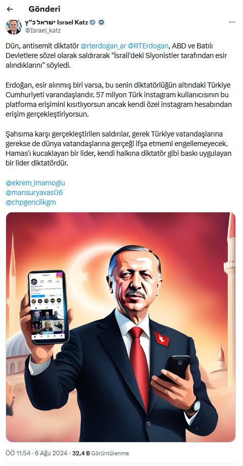 Soykırımcı İsrail'in Dışişleri Bakanı Yisrael Katz yine kudurdu. Daha önce sık sık Türkiye'yi ve Başkan Recep Tayyip Erdoğan'ı hedef alan paylaşımlar yapan katil İsrail'in Dışişleri Bakanı yeni bir skandala imza attı. 'Instagram kararı' sonrası Başkan Erdoğan'a saldıran Katz'ın paylaşımına Ekrem İmamoğlu, Mansur Yavaş ve CHP Gençlik Kolları hesaplarını etiketlemesi de dikkat çekti. Dışişleri Bakanlığı da, "İsrail Dışişleri Bakanı, ülkemizi ve Sayın Cumhurbaşkanımızı hedef alan, iftira ve yalan dolu, düzeysiz paylaşımlar yapmayı alışkanlık haline getirmiştir. Bahse konu şahıs, muhatap alınacak biri olma niteliğini çoktan yitirmiştir." tepkisini getirdi.