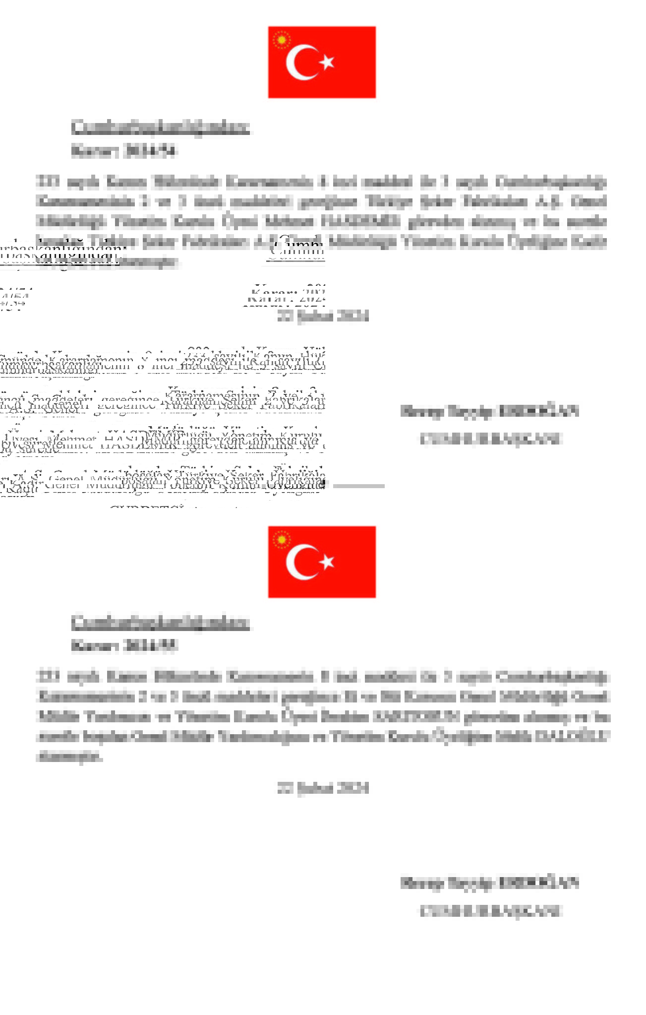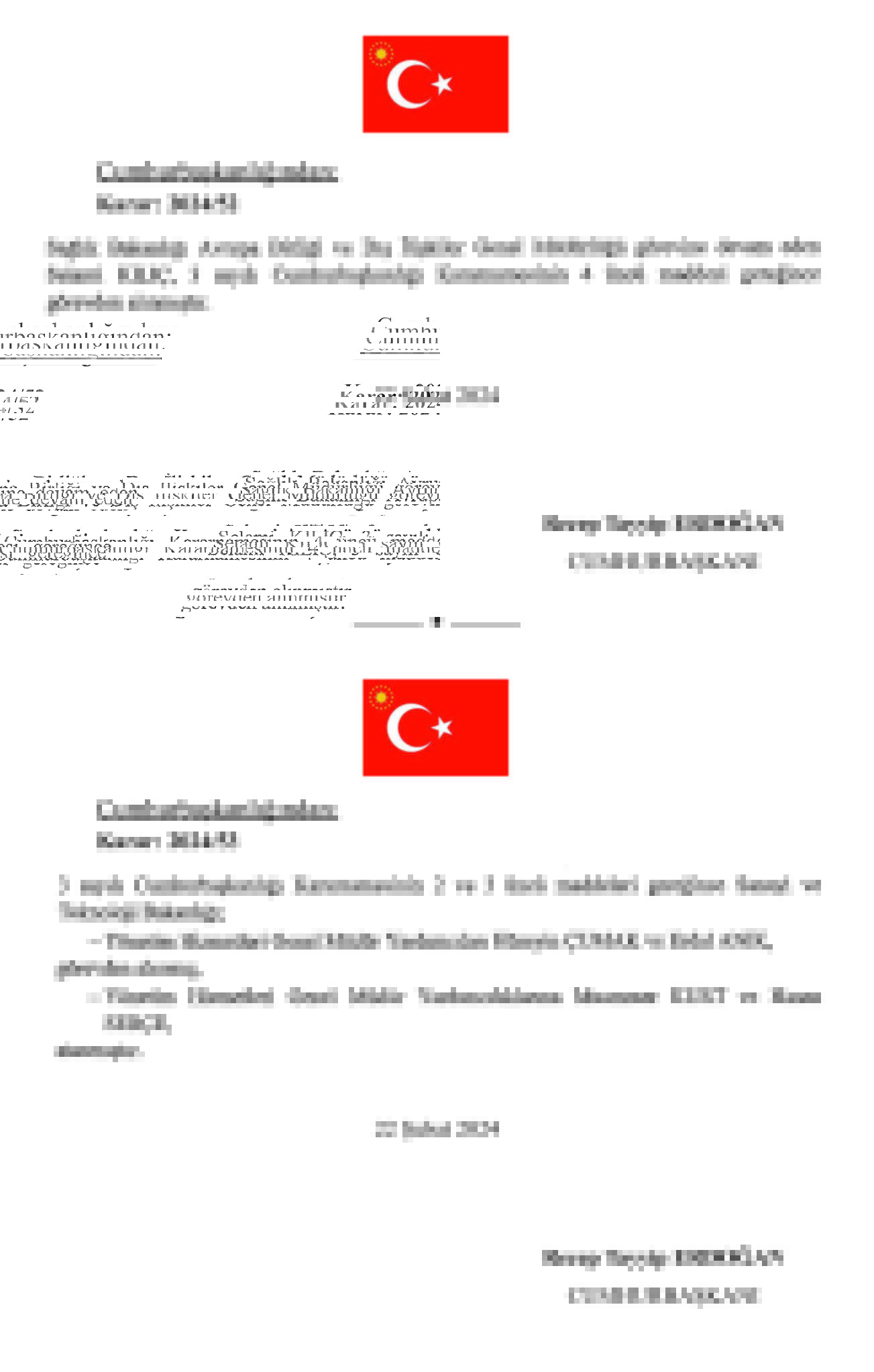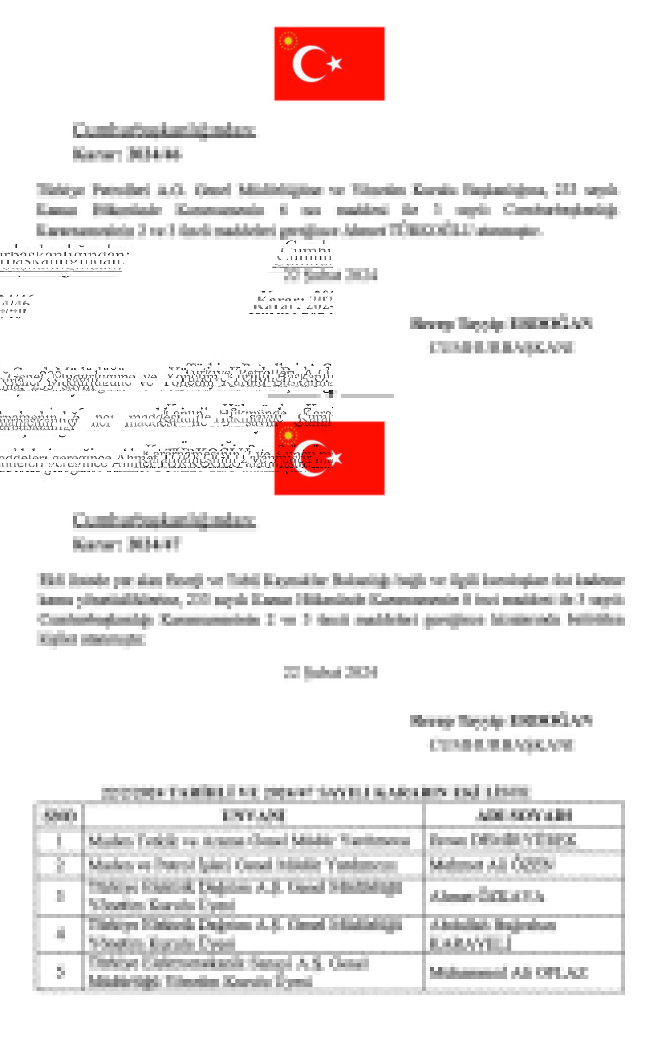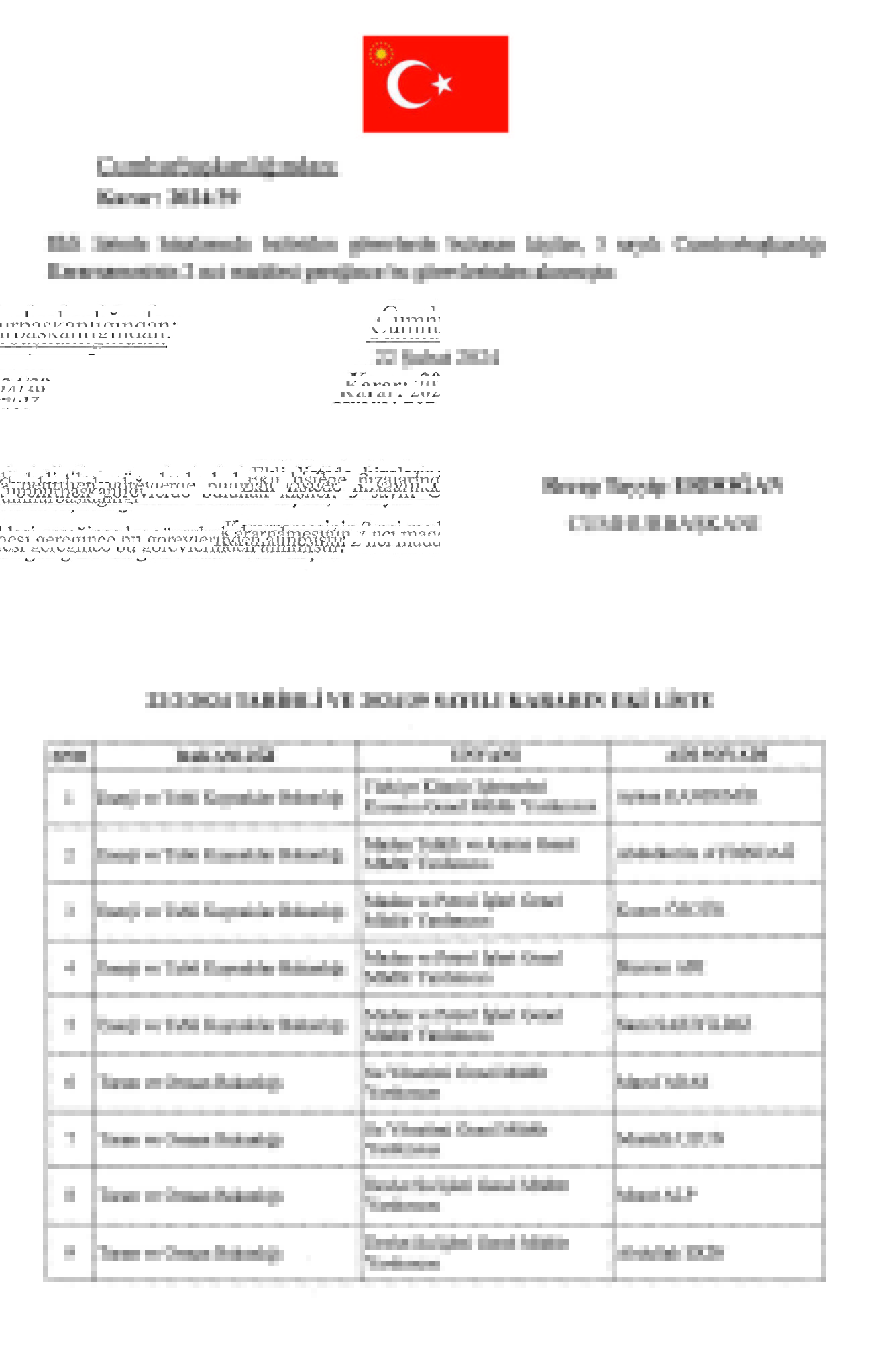 Başkan Recep Tayyip Erdoğan tarafından imzalanan Cumhurbaşkanlığı kararıyla kritik atamalar gerçekleşti. TPAO Genel Müdürlüğü'ne Ahmet Türkoğlu, Kültür ve Turizm BakanlığıSinema Genel Müdürlüğü'ne Birol Güven, MASAK Başkanlığı'na Hasan Kaymak, Adalet Bakanlığı Bakan Yardımcılığı'na Hurşit Yıldırım, Milli Piyango Genel İdaresi Müdürlüğü'ne Ekrem Candan, TCDD Genel Müdürlüğüne Veysi Kurt atandı.