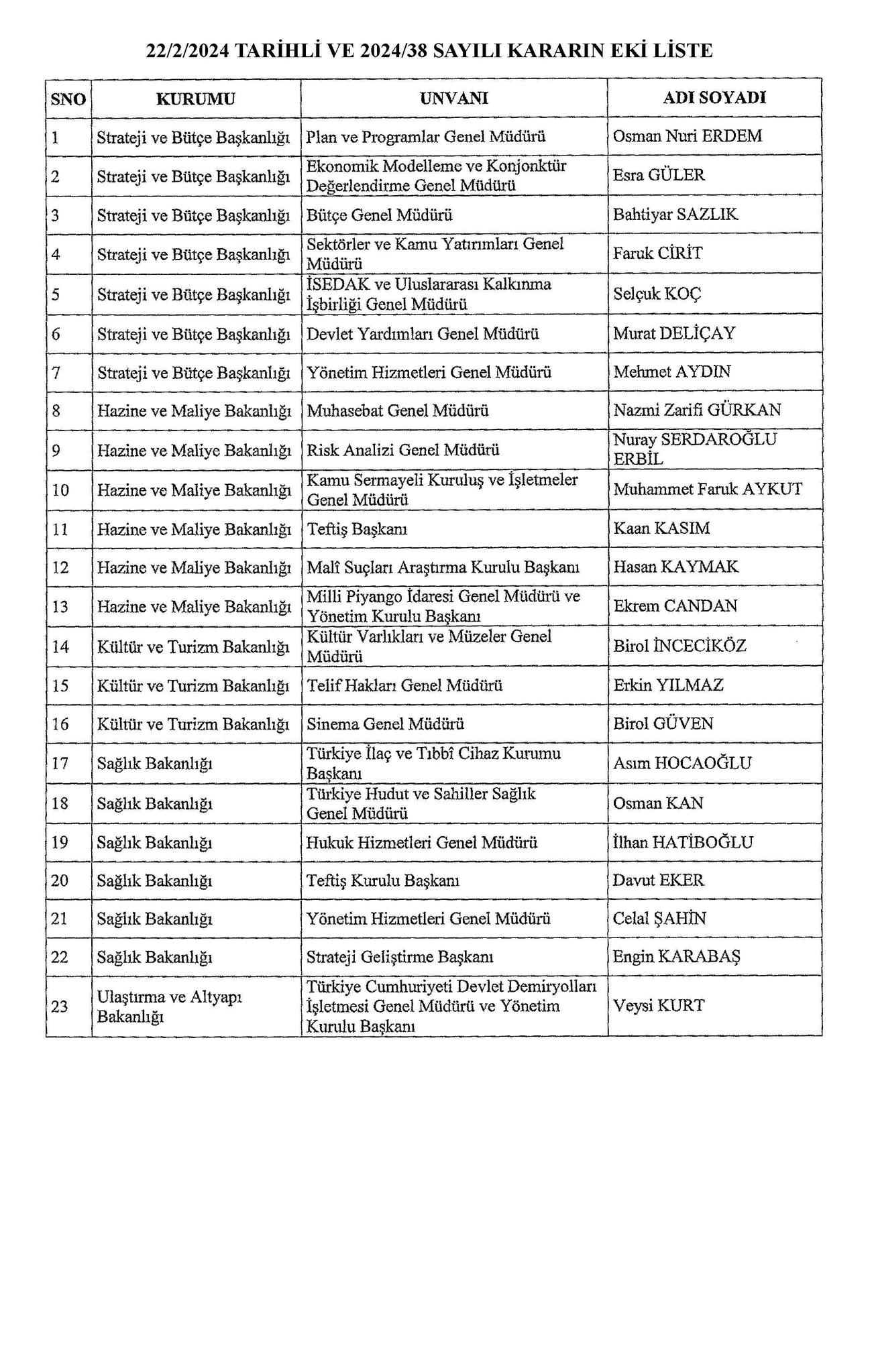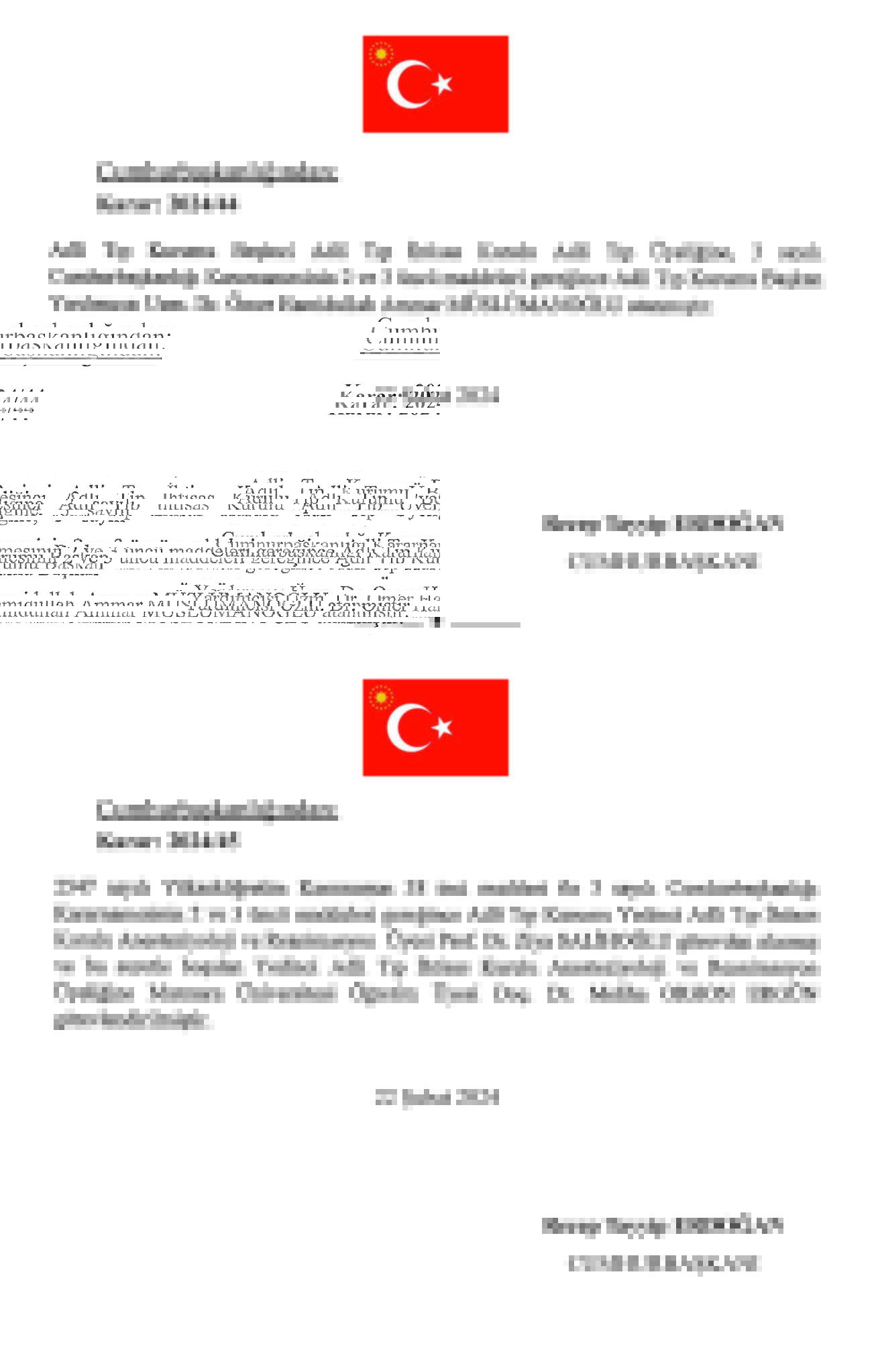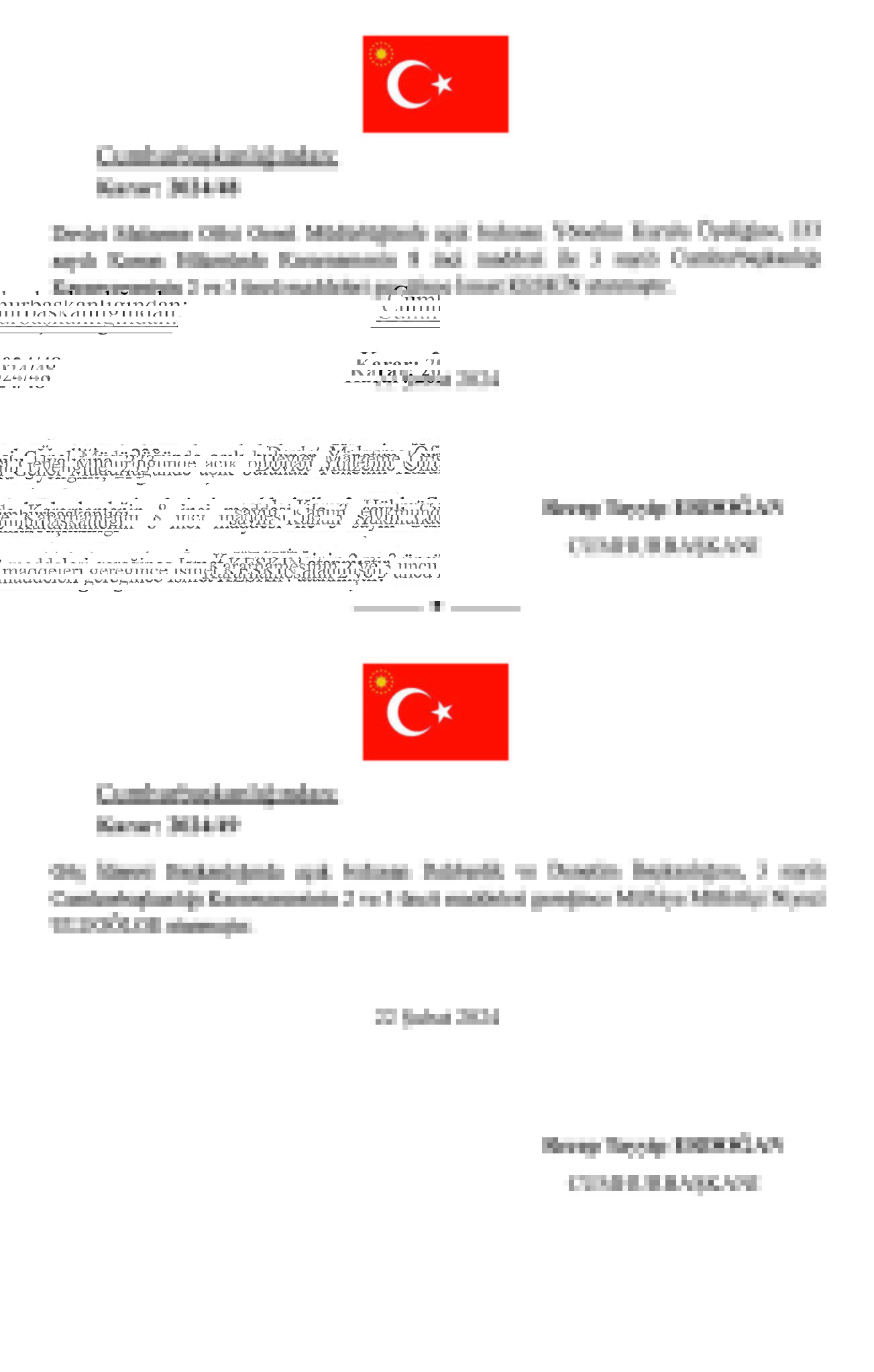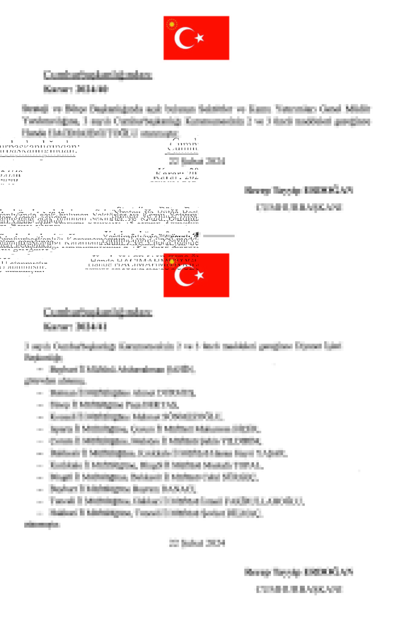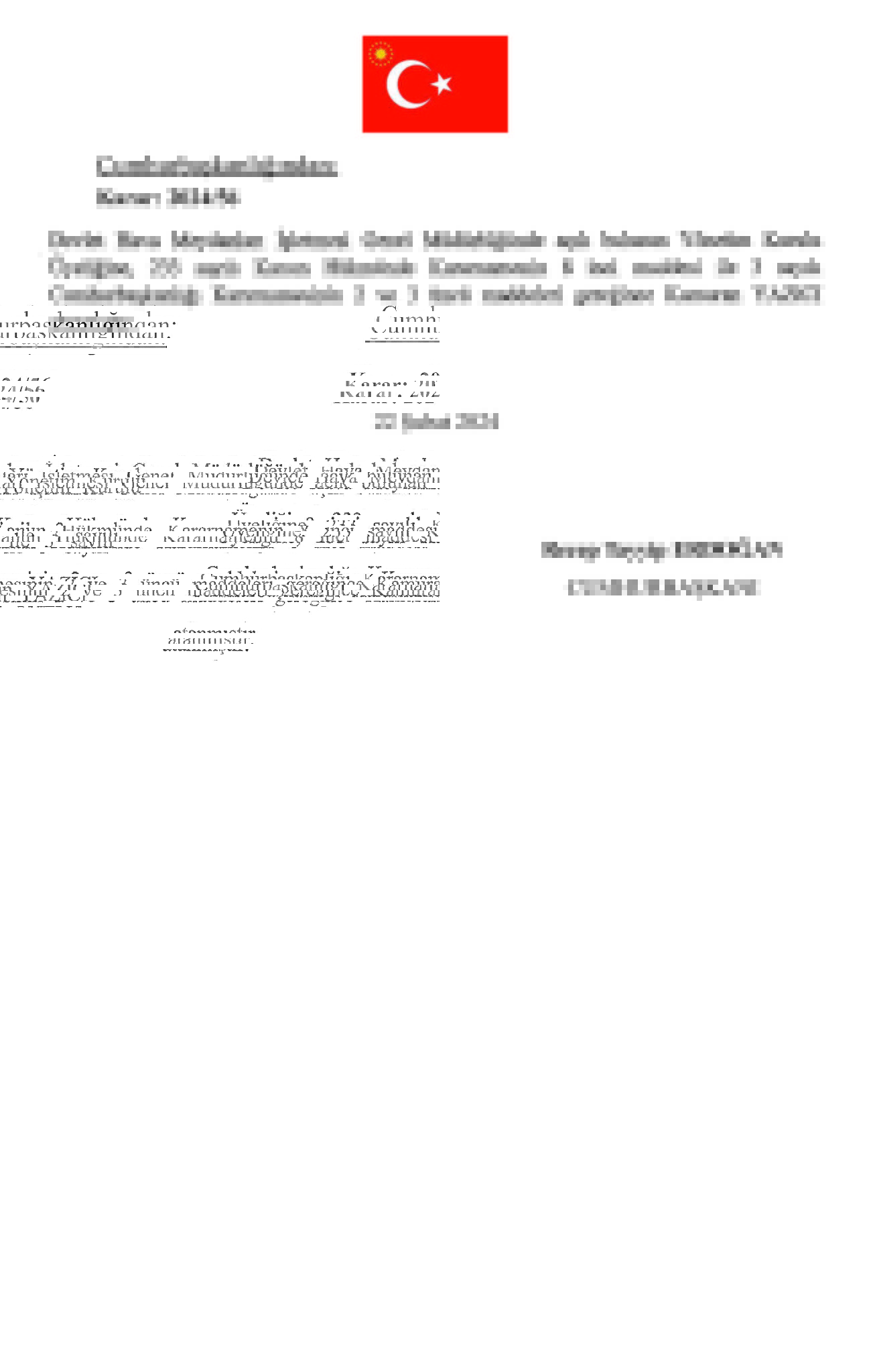 Başkan Recep Tayyip Erdoğan tarafından imzalanan Cumhurbaşkanlığı kararıyla kritik atamalar gerçekleşti. TPAO Genel Müdürlüğü'ne Ahmet Türkoğlu, Kültür ve Turizm BakanlığıSinema Genel Müdürlüğü'ne Birol Güven, MASAK Başkanlığı'na Hasan Kaymak, Adalet Bakanlığı Bakan Yardımcılığı'na Hurşit Yıldırım, Milli Piyango Genel İdaresi Müdürlüğü'ne Ekrem Candan, TCDD Genel Müdürlüğüne Veysi Kurt atandı.