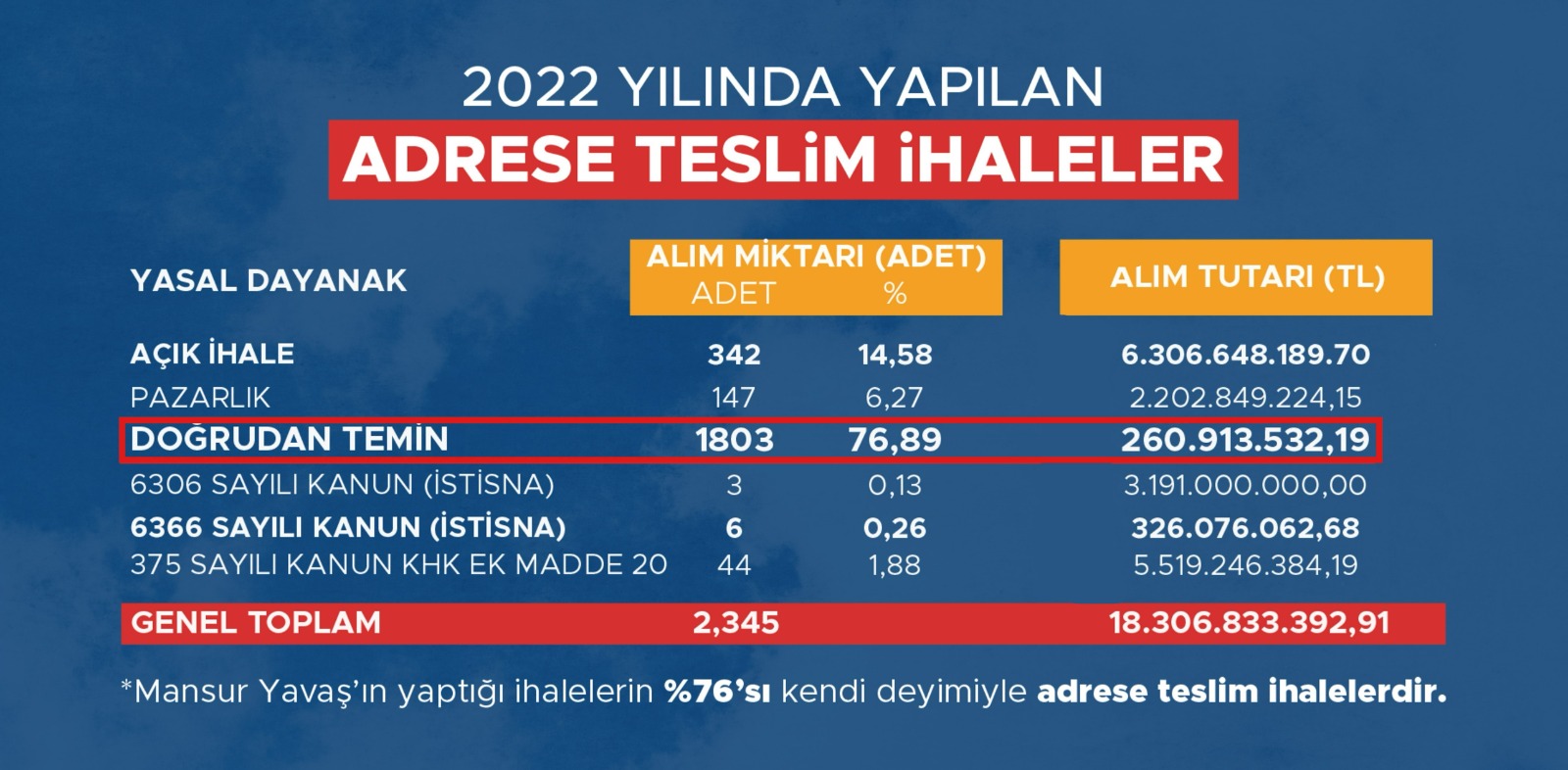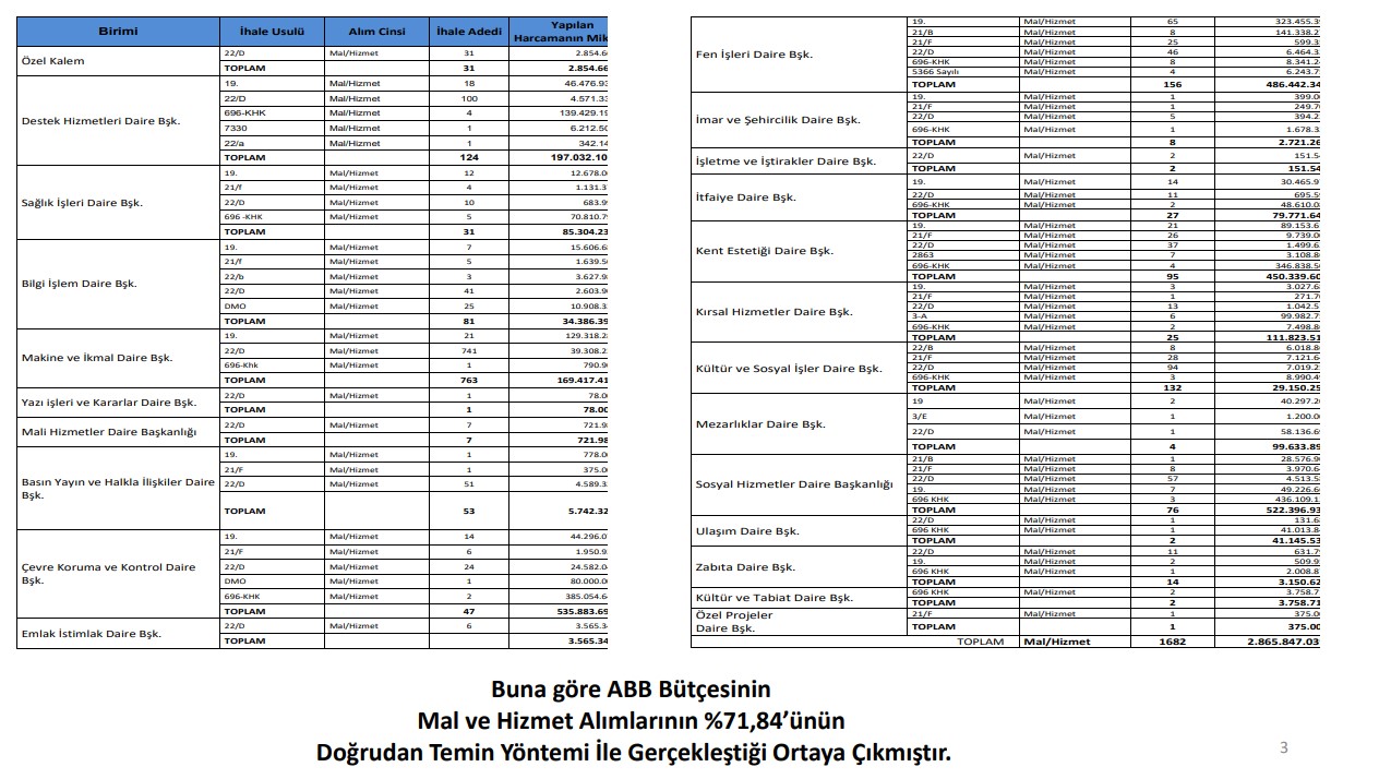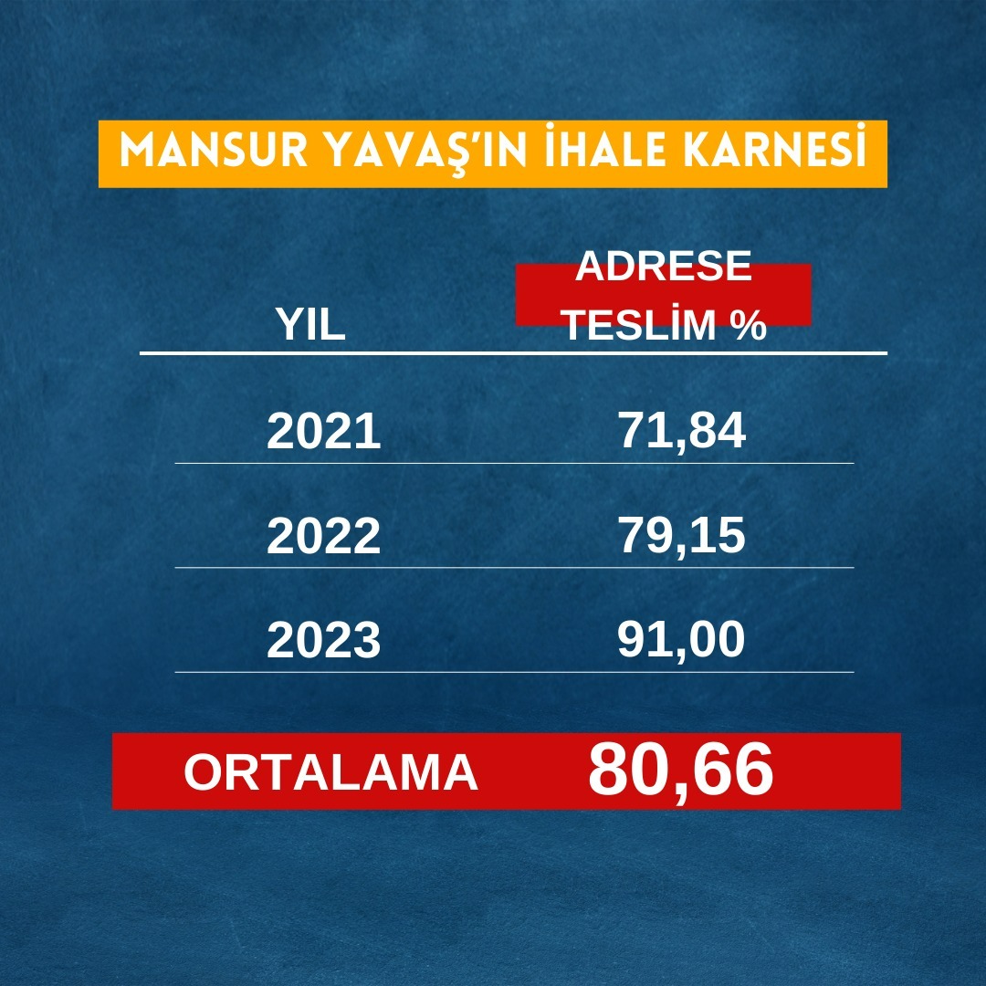 Ankara Büyükşehir Belediyesi 2023 Mali Yılı Denetim Komisyonu verilerine göre: 2023 yılında yapılan 2 bin 210 ihalenin yalnızca 202 tanesi açık ihale olarak yapıldı. Böylece yapılan ihalelerin yüzde 91'i doğrudan temin usulü ile gerçekleştirilmiş oldu. Rakam olarak 2023 yılında 12 Milyar TL üzerinde adrese teslim ihale gerçekleştirildiği tespit edildi. Dürüstlük ve şeffaflık algını oldukça başarılı yöneten Mansur Yavaş'ın, "Yemedi, yedirmedi' desinler, 'Çalmadı, çaldırmadı' desinler bana yeter. Sokağa çıkınca, rahat rahat, başım dik gezmek istiyorum." sözleri de akıllara geldi.