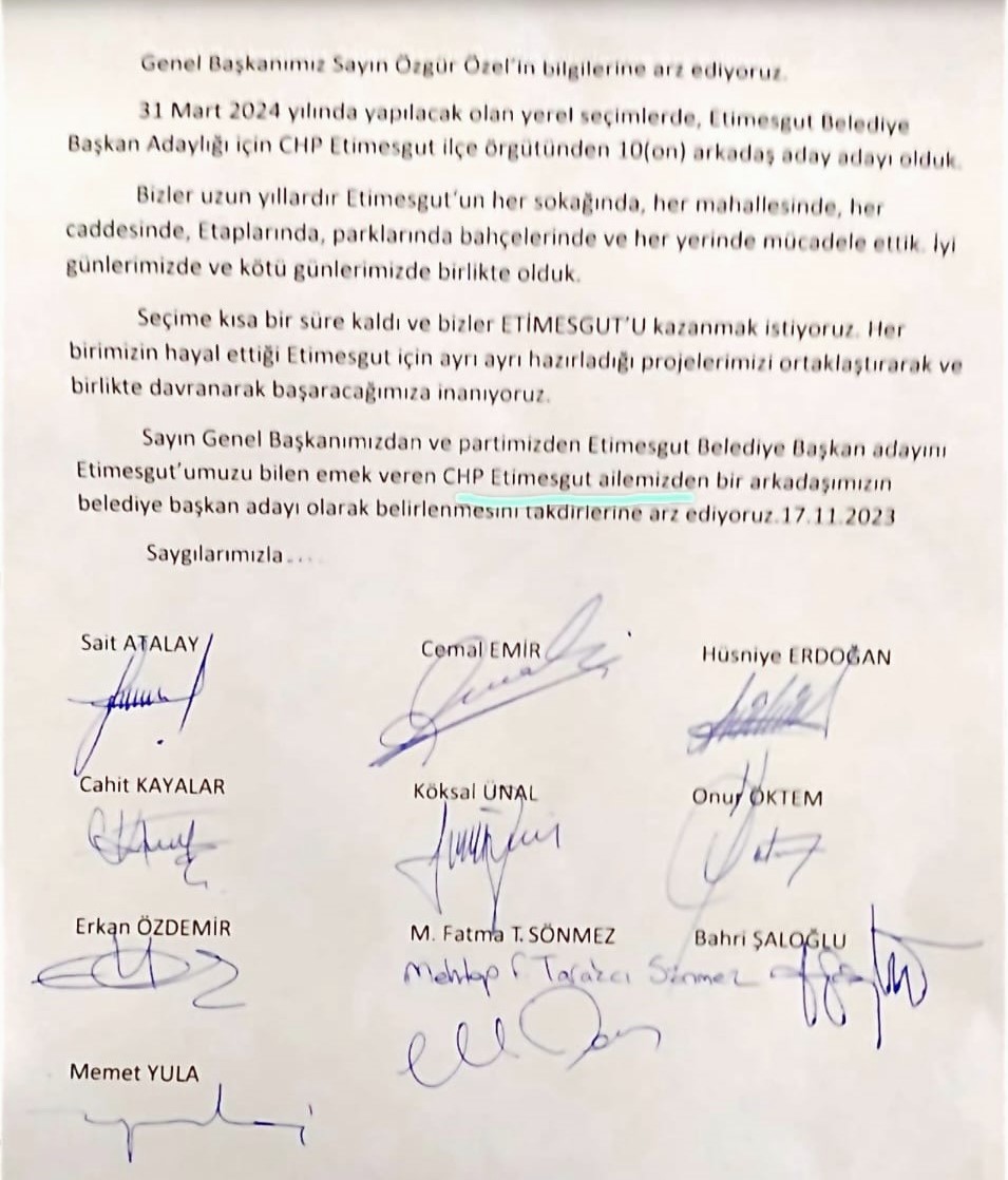 Bu duruma en sert tepki Etimesgutlu CHP'lilerden geldi. CHP'nin Etimesgut teşkilatı Genel Başkan Özgür Özel'e yazıkları belge ile açıkça Özarslan'a karşı olduklarını belirtti.
