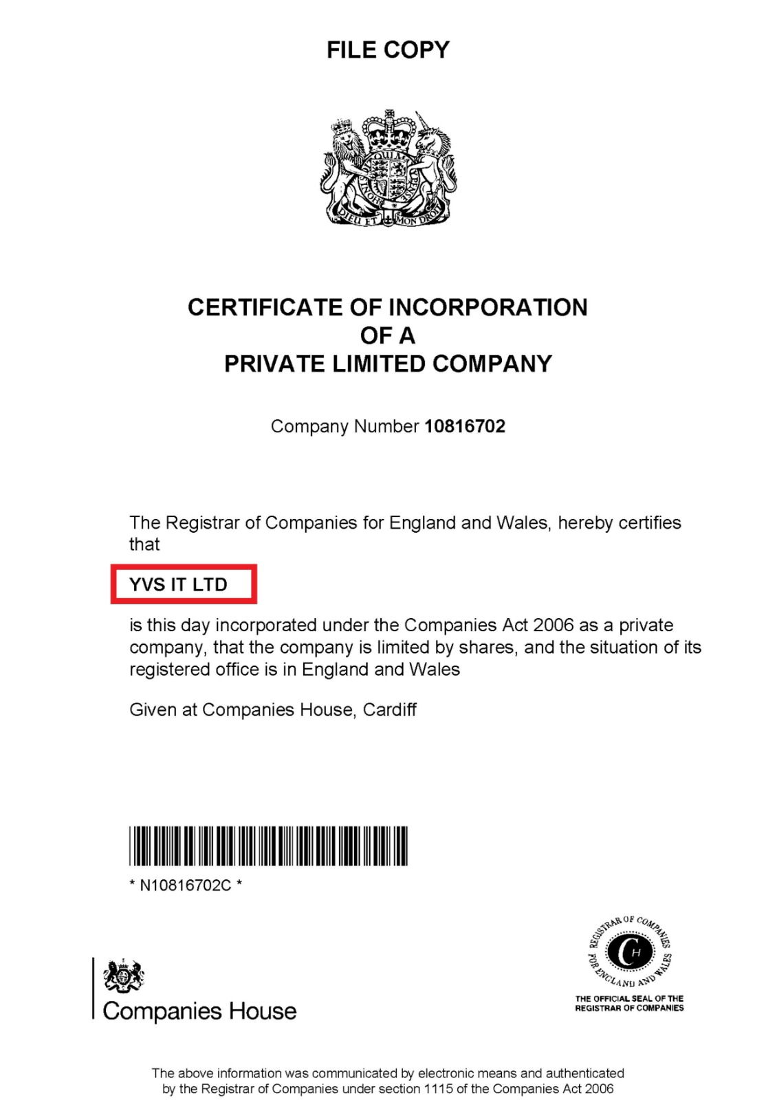 İngiltere'de kurulan şirketin adının YVS IT LTD olduğu anlaşıldı. Web sitesi de olan şirketin Birleşik Krallık'taki şirket numarasının da 10816702 olduğu görüldü.