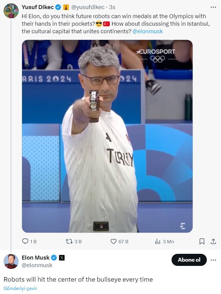 Paris 2024 Olimpiyat Oyunları'nda eli cebindeki pozuyla damga vuran Milli sporcumuz Yusuf Dikeç, bu kez Elon Musk'ı hedef aldı. Musk'ı İstanbul'a davet eden Dikeç, "Merhaba Elon, sizce geleceğin robotları elleri ceplerinde olimpiyatlarda madalya kazanabilecekler mi?" sorusunu yöneltti. Elon Musk'ın yanıtı ise gecikmedi...