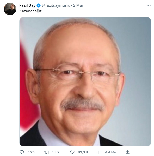 Muhalefet liderlerini o anki siyasi görüşüne göre ahlaksızca yakıştırmalarla eleştiren Fazıl Say Kılıçdaroğlu, Akşener ve İnce sıralamasından sonra tekrar başa döndü ancak bu kez rolleri farklı dağıttı. Keşke CHP'nin başında Canan Kaftancıoğlu olsaydı dediği günlerden Kılıçdaroğlu'nun fotoğraflarını hayranlıkla paylaşıp 'Kazanacağız' tweetleri atan ve karşısındaki herkese kadın erkek demeden hakaretler eden Fazıl Say'a dönüştü.
