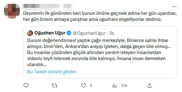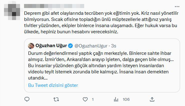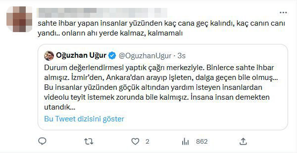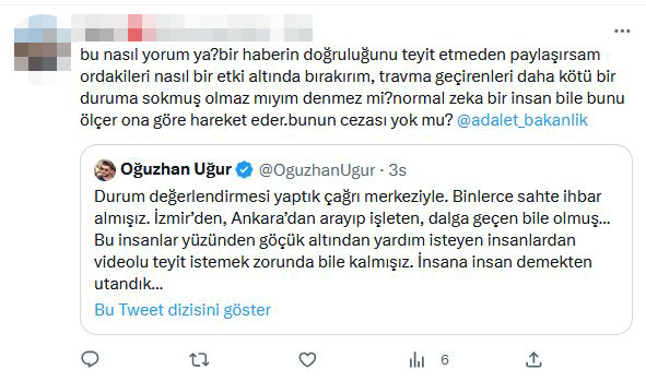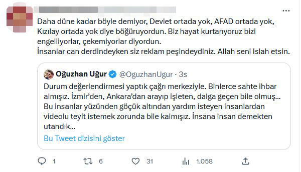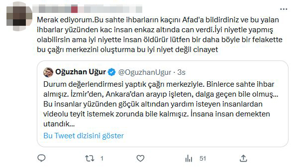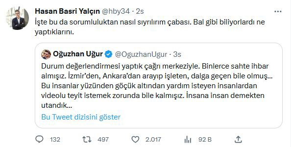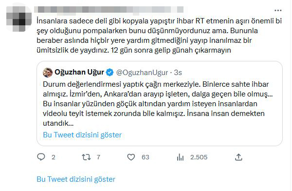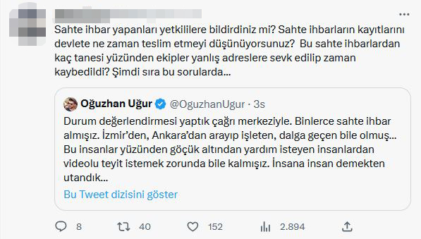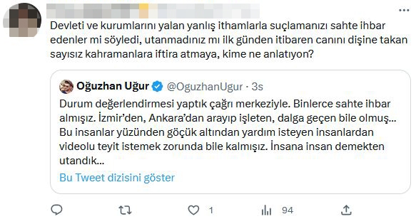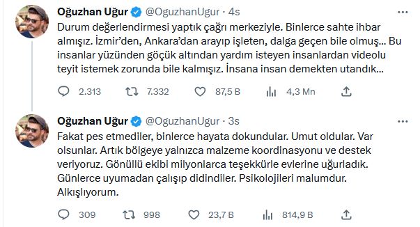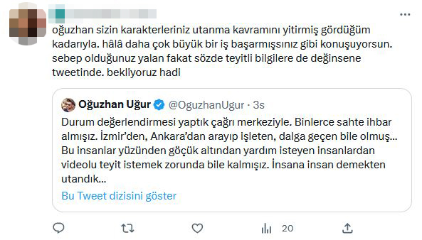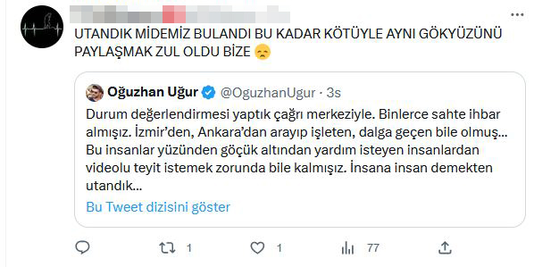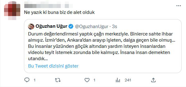 Oğuzhan Uğur, Twitter hesabından adeta itiraf niteliğinde bir açıklama yaptı. Uğur, "Durum değerlendirmesi yaptık çağrı merkeziyle. Binlerce sahte ihbar almışız. İzmir'den, Ankara'dan arayıp işleten, dalga geçen bile olmuş… Bu insanlar yüzünden göçük altından yardım isteyen insanlardan videolu teyit istemek zorunda bile kalmışız. İnsana insan demekten utandık…" diyerek adeta günah çıkarmaya kalktı.