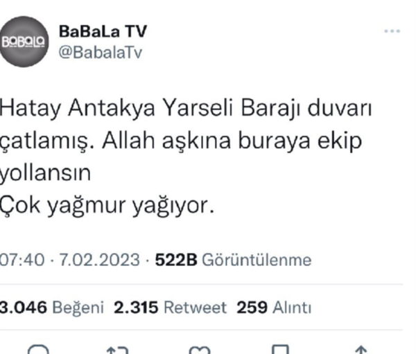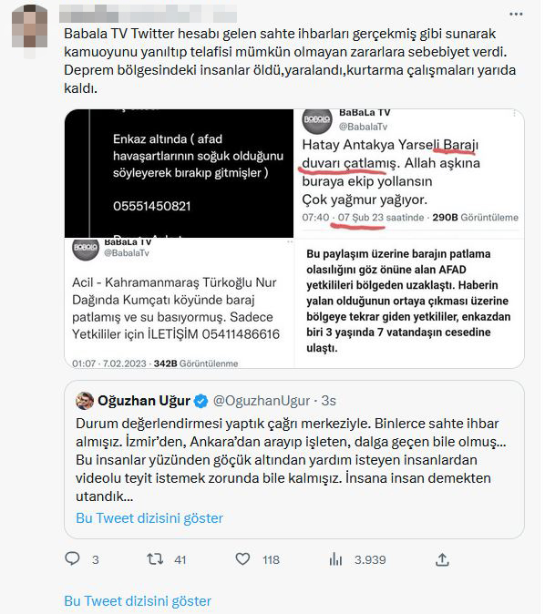 Kahramanmaraş merkezli depremler sonrası binlerce insan enkaz altında hayata tutunmaya çalışırken sosyal medyada asılsız çağrıların yayılmasına sebep olan Babala TV sahibi Oğuzhan Uğur'dan itiraf niteliğinde bir açıklama geldi. Oğuzhan Uğur, durum değerlendirmesi yaptıklarını belirterek binlerce sahte ihbar aldıklarını kaydetti. Kullanıcılar Uğur'un skandal açıklamalarına, "Binlerce sahte ihbar "yaydınız" şimdi günah çıkartır gibi sahte ihbar almışız diyorsunuz. Oysa milletin ilk günden bu zamana kadar olan uyarılarını saf kötülük diye paylaştınız. yazık" diyerek tepki gösterdi.