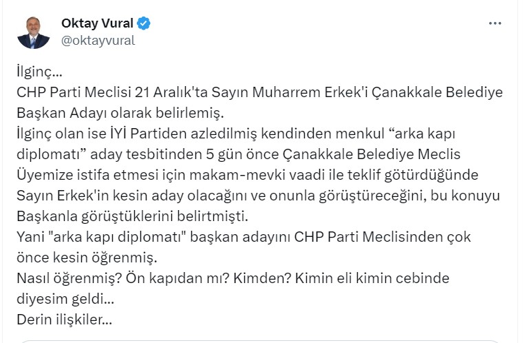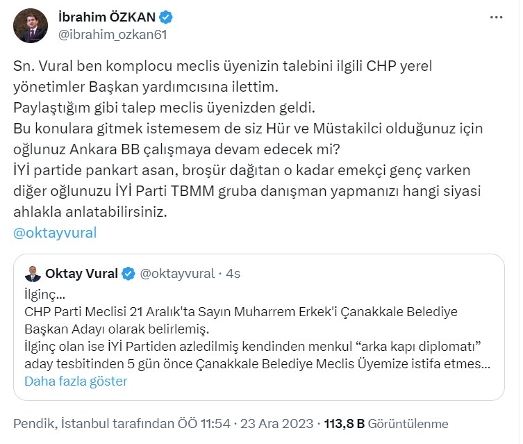 İYİ Parti'de şimdi de ahlak kavgası çıktı. İYİ Siyasi İşler Başkanı Oktay Vural, partiden istifa eden İBB İYİ Parti eski Grup Başkanvekili İbrahim Özkan'ı hedef aldı. "Muharrem Erkek'in adaylığını biliyordu. Çanakkale teşkilatını istifaya çağırdı" çıkışı yaptı. İddialara anında yanıt veren İbrahim Özkan, Oktay Vural'ı ahlak üzerinden hedef aldı: Oğlunuz Ankara BB'de çalışmaya devam edecek mi?