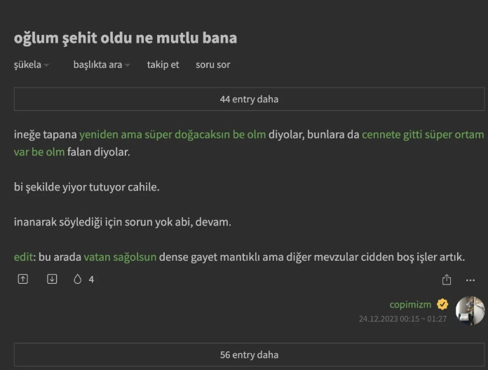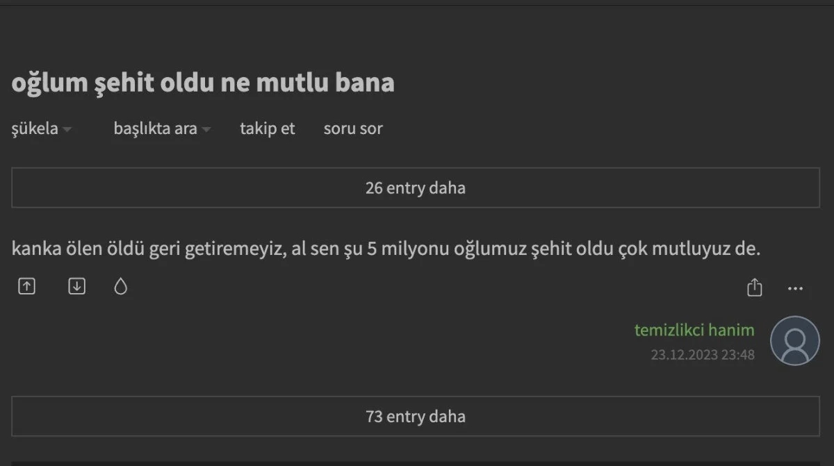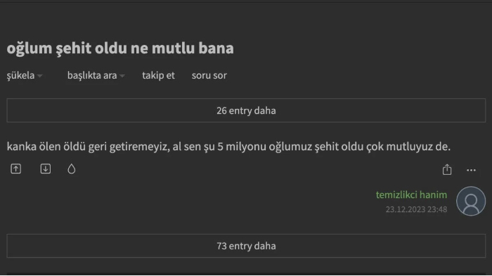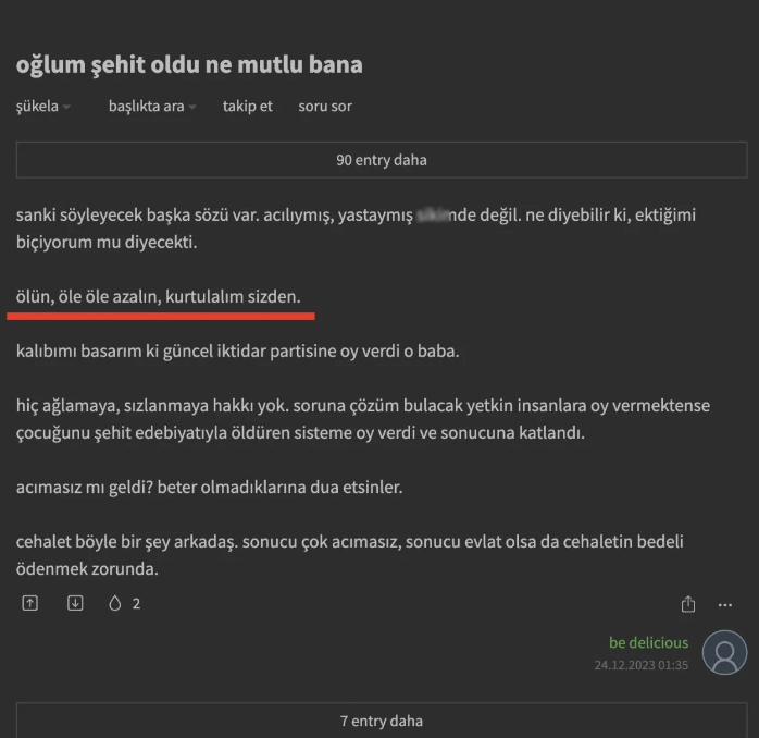 Bir şehit babasının "Oğlum şehit oldu ne mutlu bana" paylaşımına tepki çeken yorumlar yapan bir sözlük yazarı, "Ölün, öle öle azalın, kurtulalım sizden" ifadelerini kullandı.