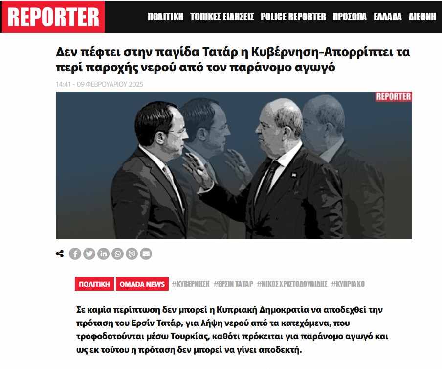SABAH'ın 8 Şubat'ta yayınladığı "Toroslar'ın suyu adaya barış getirsin" başlıklı Kuzey Kıbrıs Türk Cumhuriyeti (KKTC) Cumhurbaşkanı Ersin Tatar röportajı, Rum kesiminde gündem oldu.