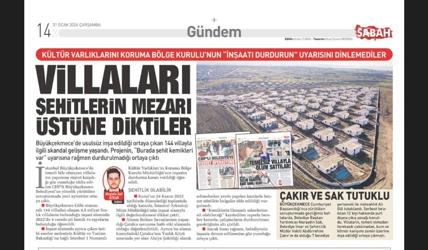 SABAH, CHP'li Büyükçekmece Belediyesi'nin temelsiz 144 villadan oluşan 8.5 milyar liralık ölüm sitesinin bulunduğu bölgede 2 yıl önce 4 cesede ait kemik bulunduğunu, İstanbul 1 Numaralı Kültür Varlıklarını Koruma Bölge Kurulu Müdürlüğü'nce inşaatın durdurma kararı verildiğini duyurdu.