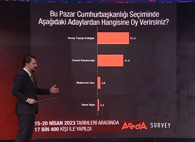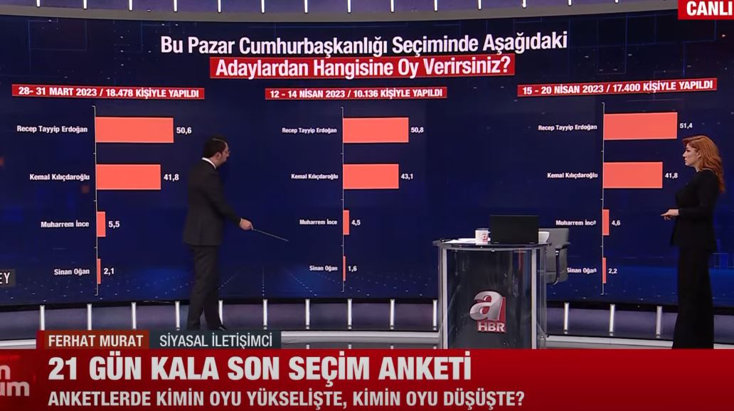 14 Mayıs Genel Seçimleri için artık sayılı günler kaldı. Siyasal İletişimci Ferhat Murat, seçime 21 gün kala son anket verilerini paylaştı ve değerlendirmelerde bulundu. Areda Survey tarafından yapılan son araştırmaya göre Cumhurbaşkanlığı seçimlerinde Başkan Recep Tayyip Erdoğan ilk turda kazanıyor. AK Parti ise milletvekili seçimlerinde açık ara öndeyken Cumhur İttifakı da yüzde 50'yi aşıyor. Öte yandan Başkan Erdoğan'ın sunduğu proje ve vizyonun vatandaşta karşılık bulduğu son bir ayda Erdoğan ve AK Parti'nin oylarını artırdığı da gözlendi.