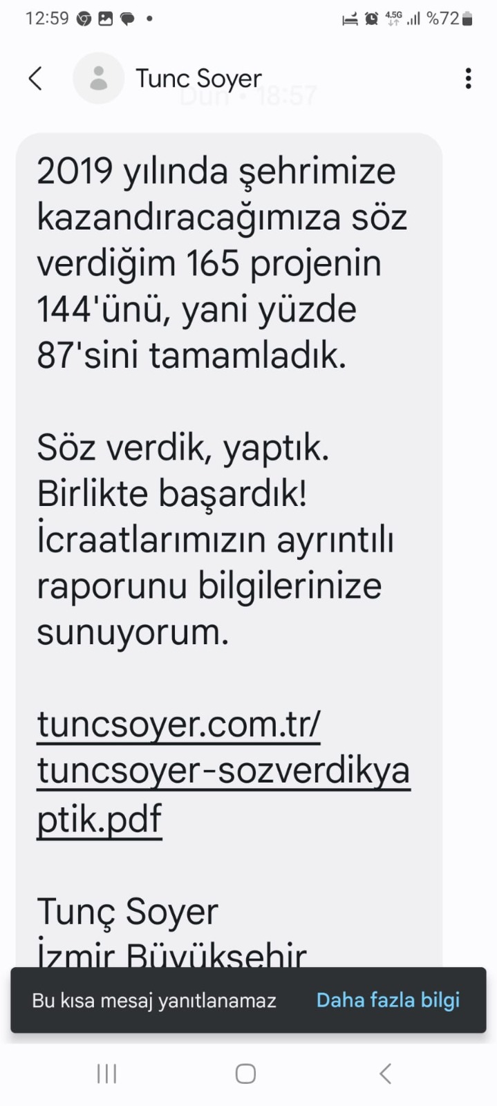 Ekrem İmamoğlu, Mansur Yavaş ve Özlem Çerçioğlu'nun yaklaşmakta olan yerel seçimlerde CHP'den tekrar aday gösterileceğini açıklayan CHP Genel Başkanı Özgür Özel, Tunç Soyer'in adaylığı ile ilgili "Memnuniyet anketi belirleyecek" dedi. Panikleyen Soyer, Parti genel merkezinin yapacağı anket öncesi İzmirlilere şirin gözükmek için önceki gün kentte yaşayan milyonlarca seçmenin cep telefonuna SMS mesajı göndererek göreve geldiği Mart 2019'dan bu yana yapmayı vadettiği 165 projeden 144'ünü yani yüzde 87'sini tamamladığını iddia etti.