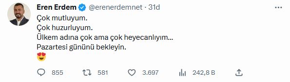Kemal Kılıçdaroğlu'na yakınlığı ile bilinen CHP'li Eren Erdem toplantı sonrası sosyal medya hesabından, "Çok mutluyum. Çok huzurluyum. Ülkem adına çok ama çok heyecanlıyım… Pazartesi gününü bekleyin." mesajını paylaştı.