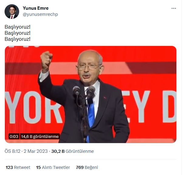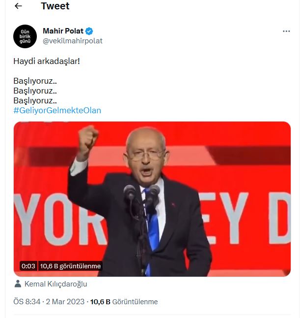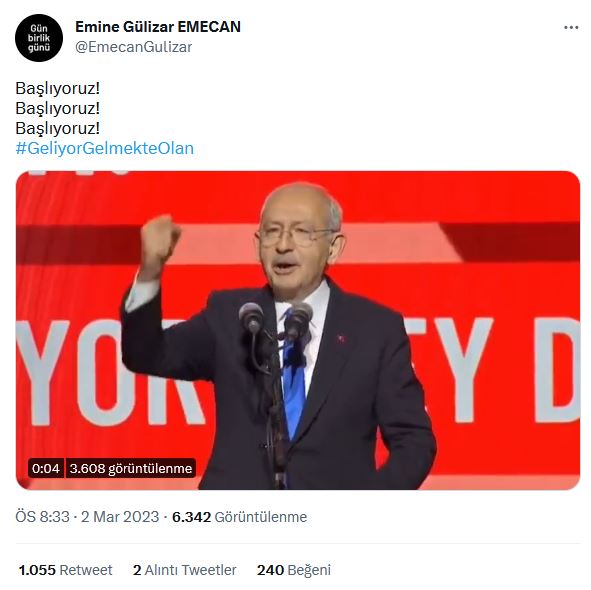 CHP Parti Meclisi Üyesi ve Kılıdçaroğlu'nun danışmanı Deniz Demir de Kılıçdaroğlu vurgusu ile "başlıyoruz" paylaşımında bulundu.