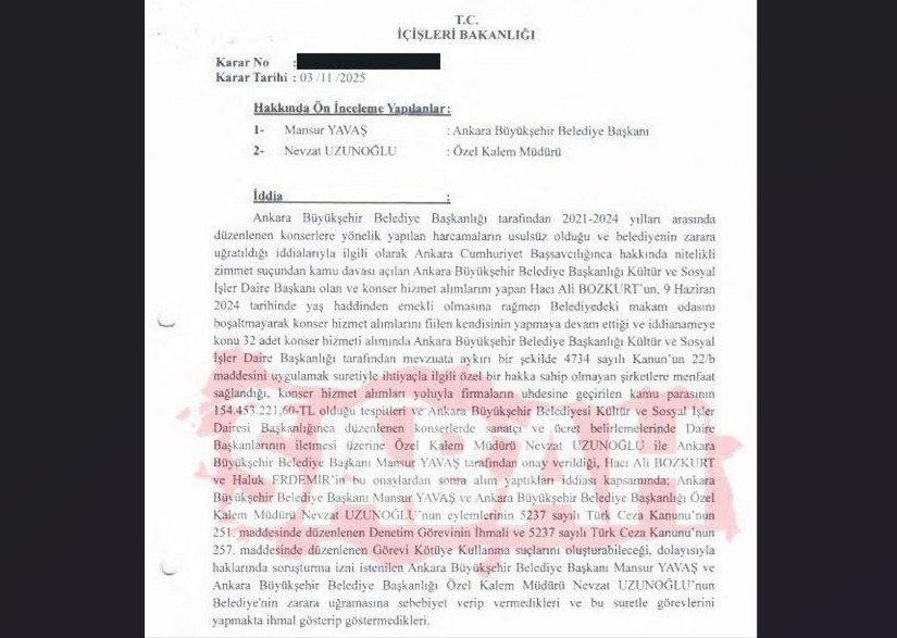 Son dakika haberi: SABAH, İçişleri Bakanlığı'nın Ankara Büyükşehir Belediyesi'ndeki "konser harcamaları" soruşturmasında ABB Başkanı Mansur Yavaş'a yönelik İçişleri Bakanlığı'nın verdiği soruşturma izninin belgesine ulaşırken, soruşturma dosyasında ortaya çıkan Kültür ve Sosyal İşler Daire Başkanlığı çalışanı Fulya K.'nın ifadesi, belediye içindeki usulsüzlük iddialarını da yeni bir boyuta taşıdı.