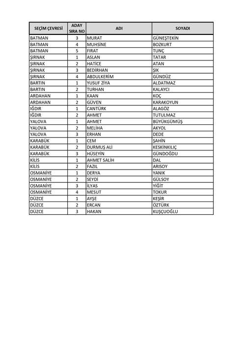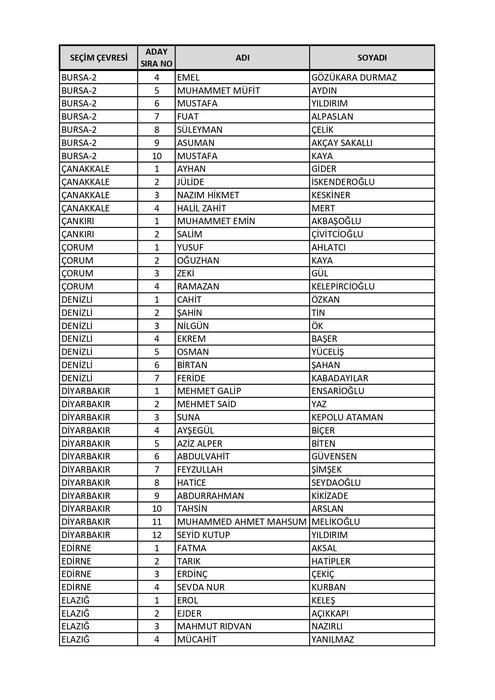 Cumhurbaşkanı Yardımcısı Fuat Oktay Ankara 3. Bölge 1.sıra, Adalet Bakanı Bekir Bozdağ Şanlıurfa 1. sıra, Aile ve Sosyal Hizmetler Bakanı Derya Yanık, Osmaniye 1. Sıra,
