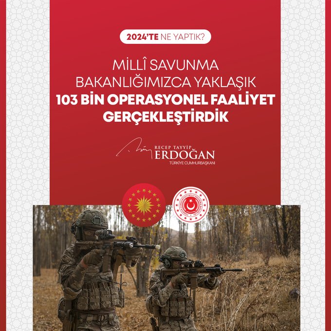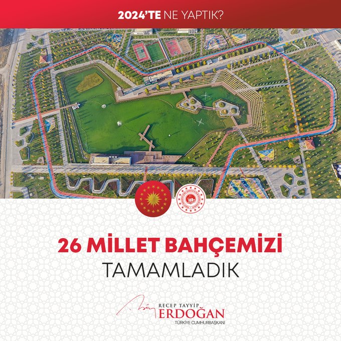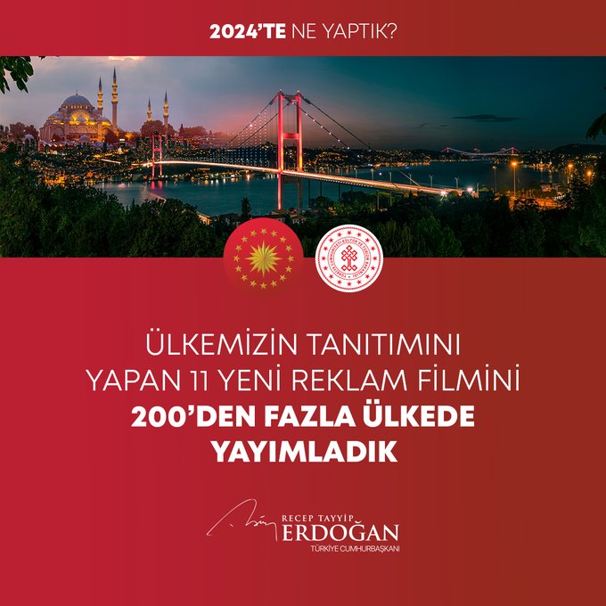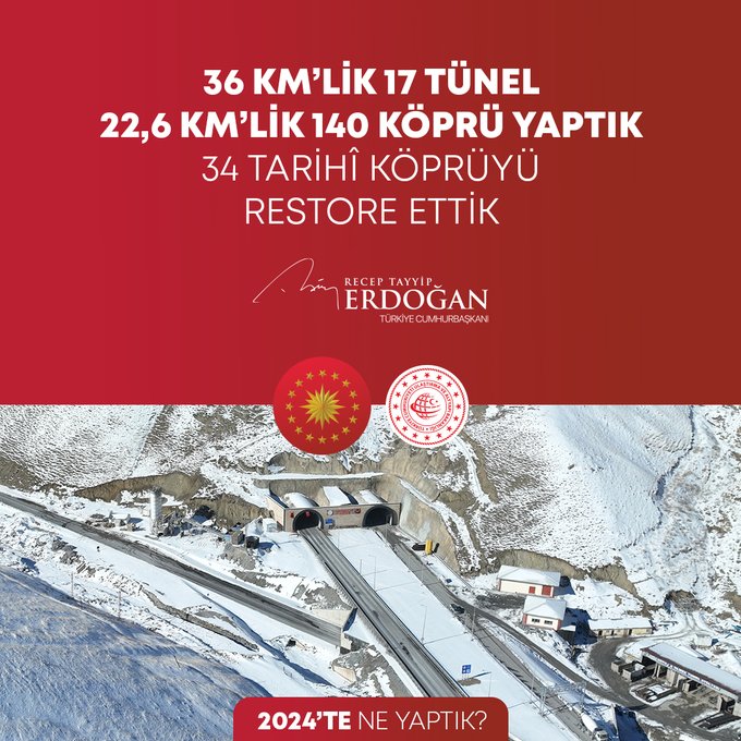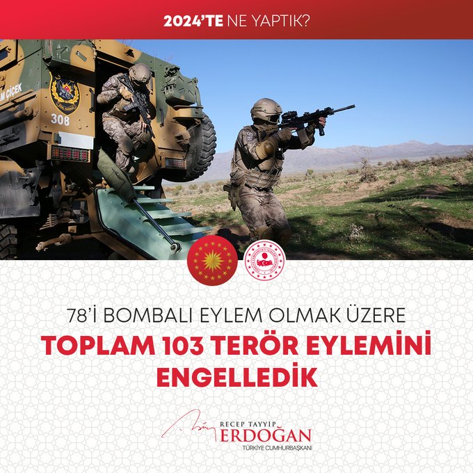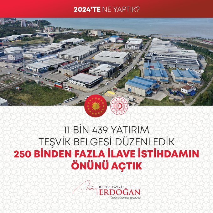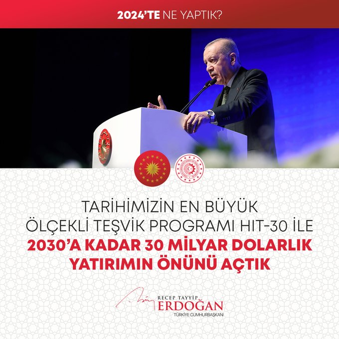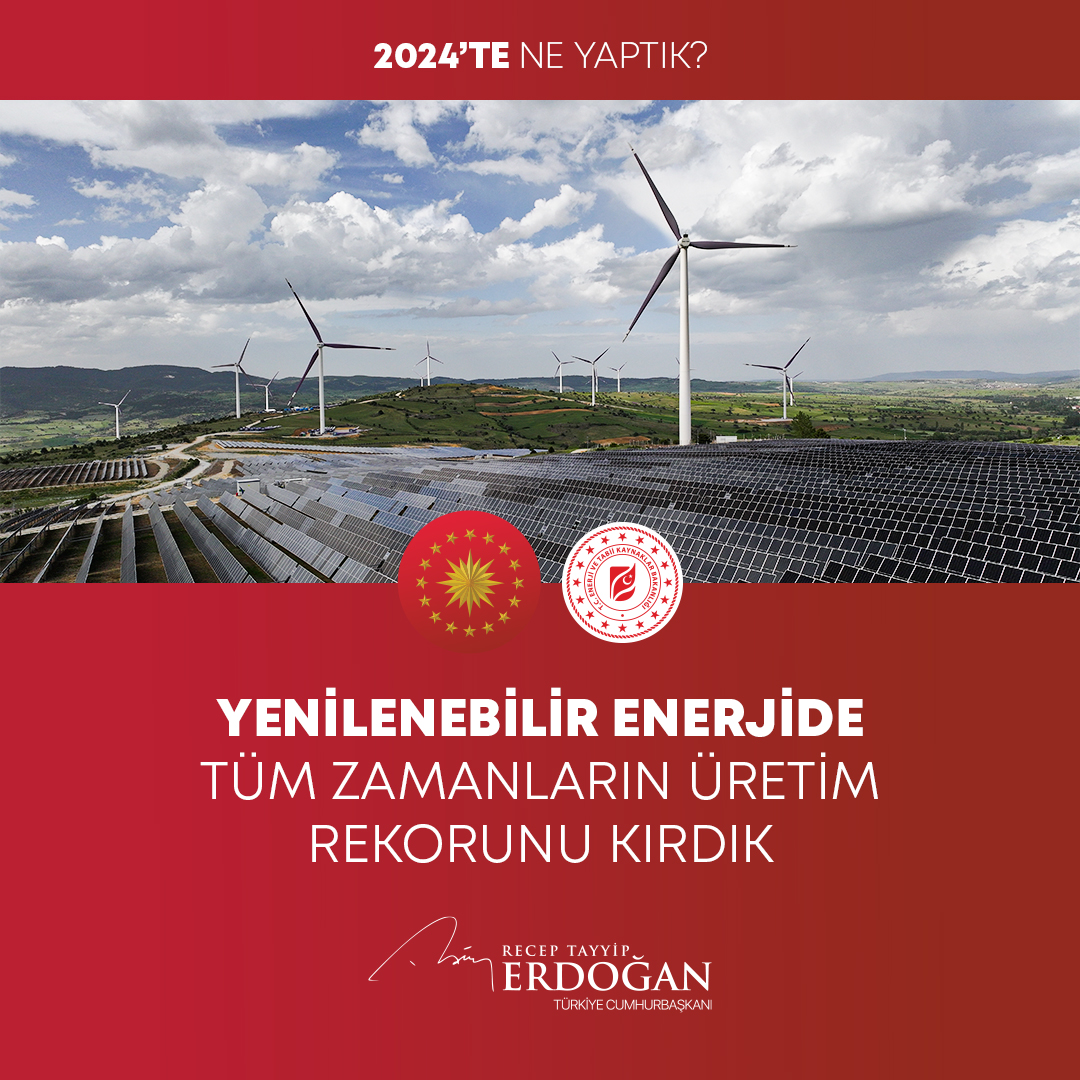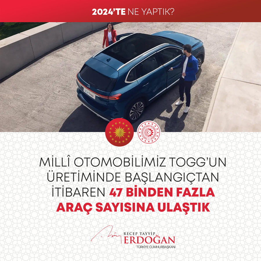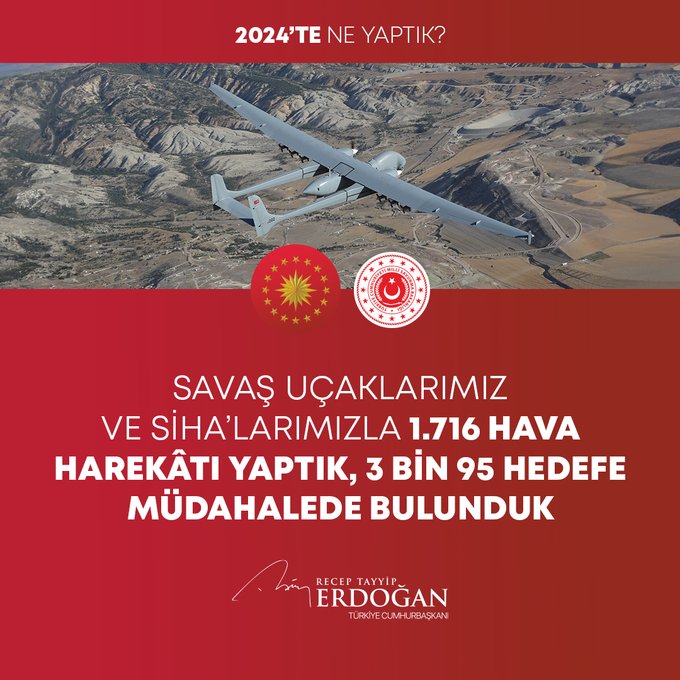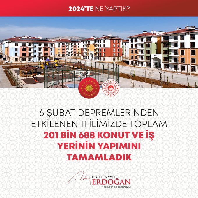 Erdoğan paylaşımında, "Aziz milletimize hizmet yolunda, 2024 yılında da durmadan, dinlenmeden, gece gündüz demeden aşkla çalıştık; ülkemize her alanda çok önemli eserler, hizmetler, projeler, yatırımlar kazandırdık. 2025 yılına girerken bu hizmetleri bir özetleyelim, hatırlayalım..." ifadelerini kullandı.