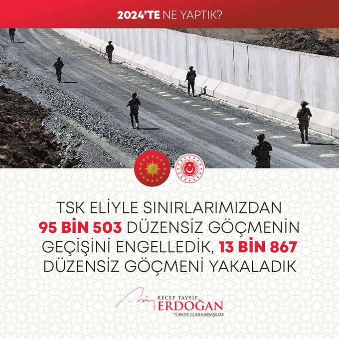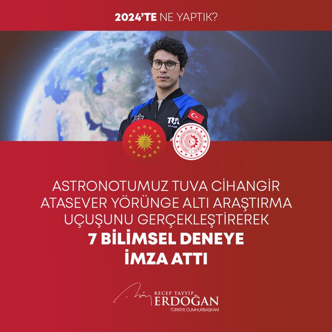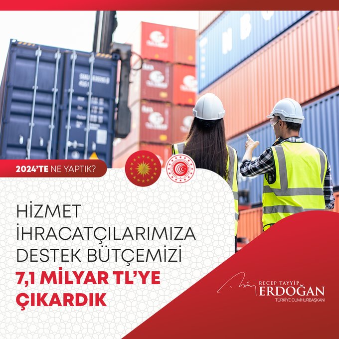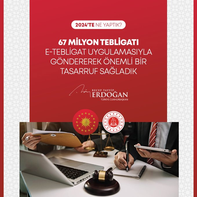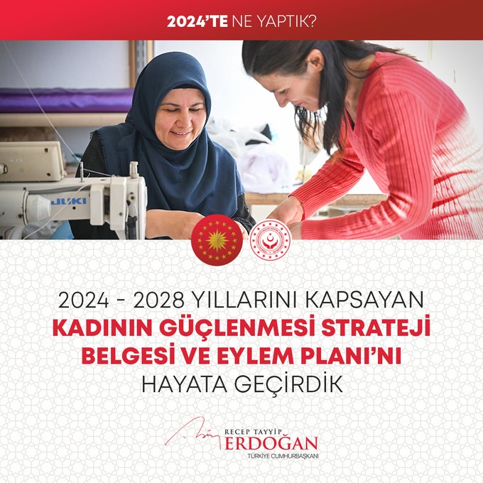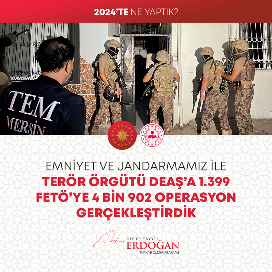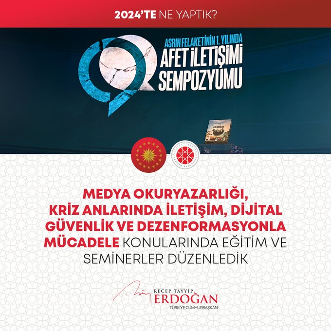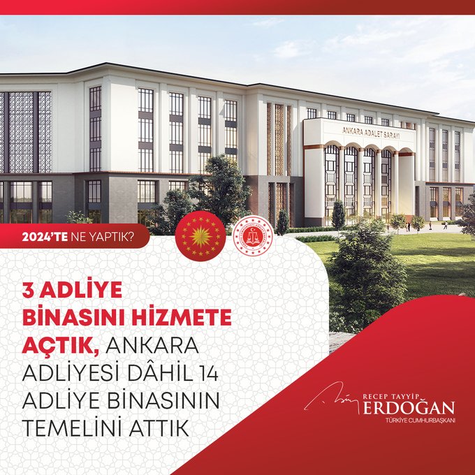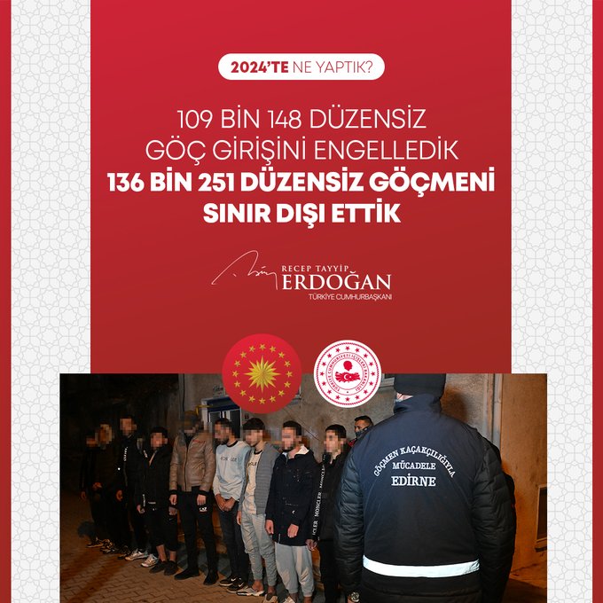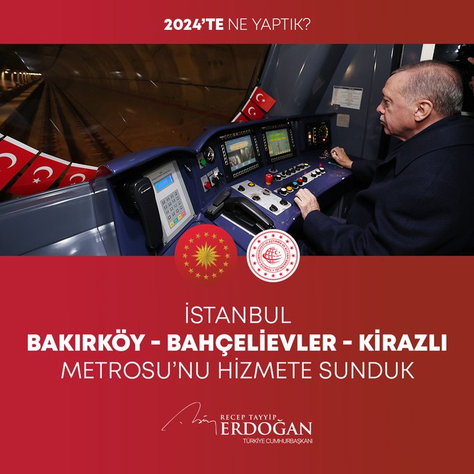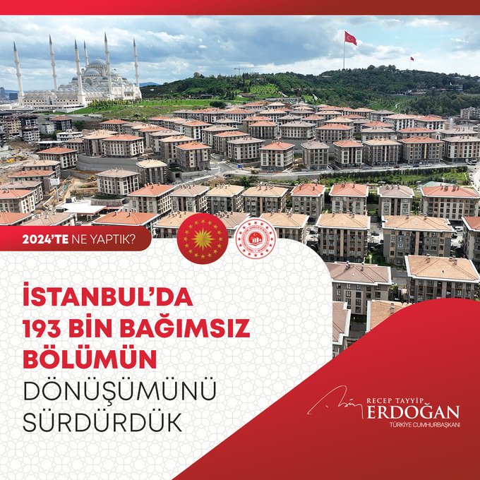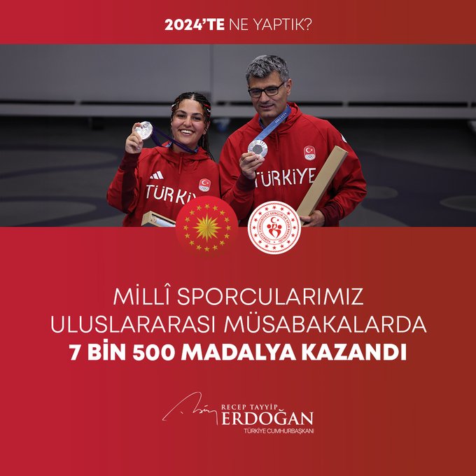 Erdoğan paylaşımında, "Aziz milletimize hizmet yolunda, 2024 yılında da durmadan, dinlenmeden, gece gündüz demeden aşkla çalıştık; ülkemize her alanda çok önemli eserler, hizmetler, projeler, yatırımlar kazandırdık. 2025 yılına girerken bu hizmetleri bir özetleyelim, hatırlayalım..." ifadelerini kullandı.