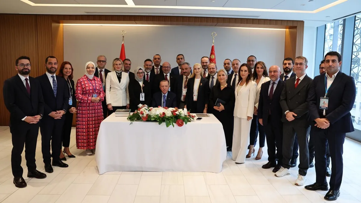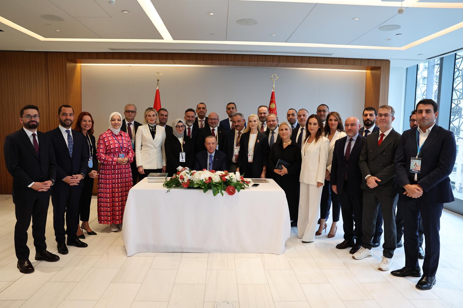 "Değerli basın mensupları, kıymetli arkadaşlar, sizleri en kalbi duygularımla, saygıyla selamlıyorum. Birleşmiş Milletler 79. Genel Kurulu'na katılmak üzere bulunduğumuz New York ziyaretimizi tamamlamak üzereyiz. İnşallah öğleden sonra gerçekleştireceğimiz ikili kabullerle ziyaretimizi başarıyla hitama erdirmiş olacağız. Cumartesi gününden bu yana oldukça yoğun bir programımız oldu. Ziyaretim vesilesiyle Birleşmiş Milletler Genel Kuruluna hitabımızın yanında birçok temas gerçekleştirdik, muhtelif etkinliklere iştirak ettik. Genel Kurul görüşmeleri öncesinde 22 Eylül günü düşünce kuruluşu temsilcileriyle bir araya geldik. Aynı günün akşamında Türk Amerikan Ulusal Yönlendirme Komitesi TASK'ın geleneksel akşam yemeğine iştirak ettik. Türk-Amerikan toplumunun ülkemizin çıkarlarını savunma noktasında yürüttüğü faaliyetleri takdirle takip ediyoruz. TAİK'in düzenlediği 15. Türkiye Yatırım Konferansı'nda Amerikan iş çevreleriyle istişarelerde bulunduk. Amerikalı girişimcilere ülkemizin sunduğu yatırım fırsatlarını anlattım. Türkiye ekonomisinin önümüzdeki dönemine dair yol haritasını kendileriyle paylaştık. Amerika son iki senedir en fazla ihracat yaptığımız ikinci, en fazla ithalat yaptığımız beşinci ülke oldu. İkili ticaret hacmimiz geçtiğimiz yıl 30 milyar doları aştı. Toplam 100 milyar dolarlık ticaret hedefimize iyi bir planlamayla ulaşabileceğimize inanıyoruz.