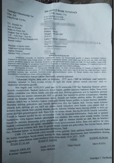 İlçe binasına girdiğinde ilk olarak Kadın Kolları Başkan Yardımcısı Aysun hanım ile karşılaştığını belirten Merve Kaya, "Aysun hanımı görünce, nasılsınız başkanım dedim, O da bana nasıl olayım, senin gibi başörtülü zihniyetler yüzünden yine seçimi kaybettik. Buradan derhal gitmeni istiyorum. Burayı terk et dedi. Ben daha ne olduğunu anlamadan, CHP İlçe Başkanı Şükrü Aksu geldi. Sen AKP'nin casusuna benziyorsun, ya buradan gidersin ya da ben seni dışarı attırırım, dedi. Büyük bir şok geçirdim.