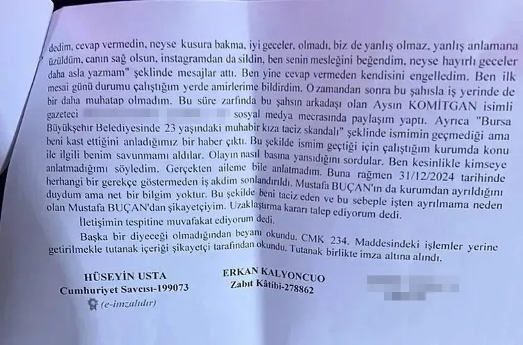 Mesajları okuyan ve şoke olan E.S ise Mustafa Buçan'ı sosyal medyadan engellemiş, ancak bu kez de cep telefonundan gelen mesajlara maruz kalmıştı. Yaşadığı tacizi Belediyedeki diğer amirlerine anlatan E.S, 31 Aralık günü işten kovuldu.