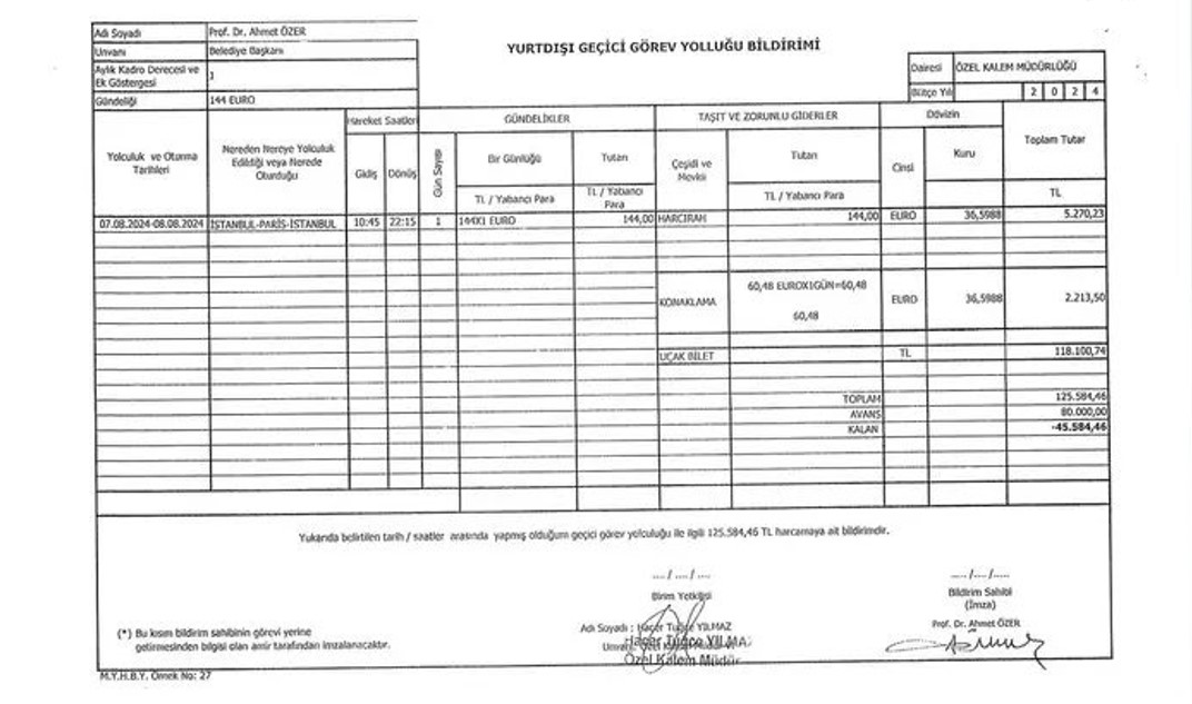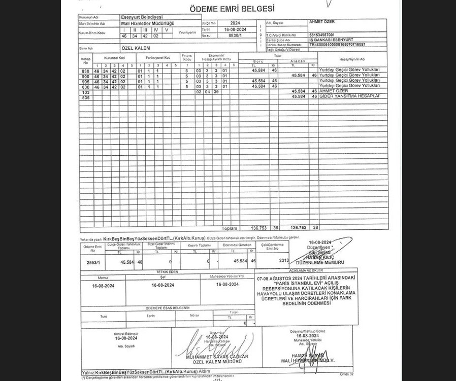 SON DAKİKA HABERİ: İBB Başkanı Ekrem İmamoğlu ve beraberindekilerin Paris'teki 'İstanbul Evi' açılışı için sözde sponsorların karşıladığı açıklanan 249 bin 260 Euro'luk harcamaya ilişkin yeni skandal ortaya çıktı. PKK'dan tutuklanan eski Esenyurt Belediyesi Başkanı Ahmet Özer'in 1 günlük gezi için belediye kasasından 183 bin TL aldığı ortaya çıktı