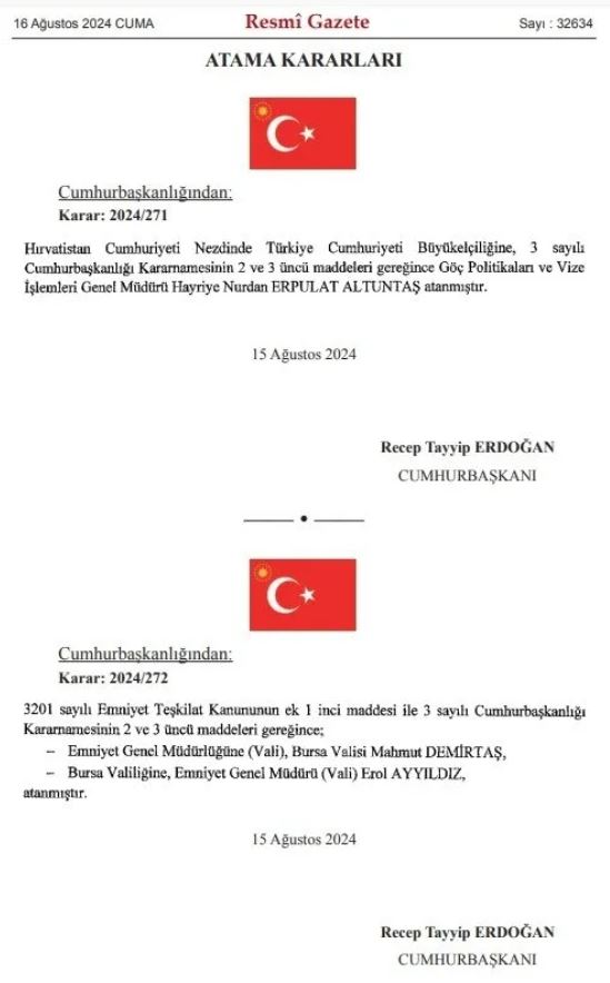 Son dakika haberi... Başkan Recep Tayyip Erdoğan imzasıyla Emniyet Genel Müdürlüğü ve Jandarma Genel Komutanlığı atamaları Resmi Gazete'de yayımlandı. Yayımlanan kararlara göre Emniyet Genel Müdürlüğüne Bursa Valisi Mahmut Demirtaş, Jandarma Genel Komutanlığına Orgeneral Ali Çardakcı atandı. Yine pek çok üniversiteye de rektör ataması gerçekleştirildi. İşte o liste...