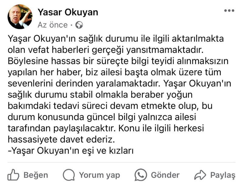 Uzun süredir hastanemizde tedavi altında olan Yaşar Okuyan'ın sağlık durumu son haftada ağırlaşmış ve 26 Aralık 2023 tarihinde saat 02.46'da tüm çabalarımıza karşı çoklu organ yetmezliği ile hayatını kaybetmiştir. Ailesine ve tüm sevenlerine başsağlığı dileriz" denildi.