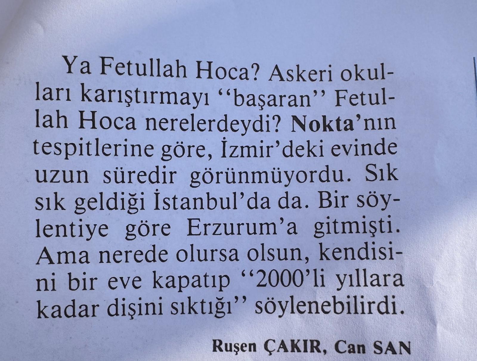 Çakır'ın 15 Temmuz hain darbe girişiminden tam 30 yıl önce yayımlanan yazısında Gülen hakkında "Nokta'nın tespitlerine göre, Fetullah Hoca İzmir'deki evinde uzun süredir görünmüyordu.