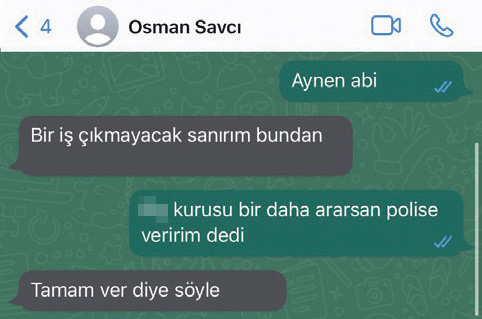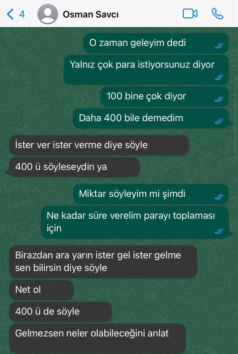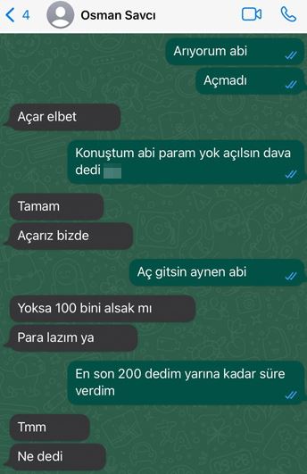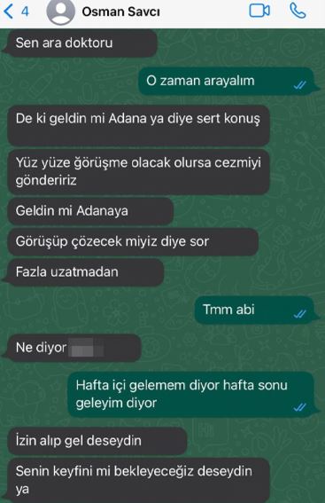 Ele geçirilen WhatsApp konuşmalarında, örgüt üyesinin savcının talimatıyla bir doktordan "takipsizlik kararı" karşılığında para istediği yer alırken, örgüt üyesi ile savcı arasında geçen diyalog şöyle:
