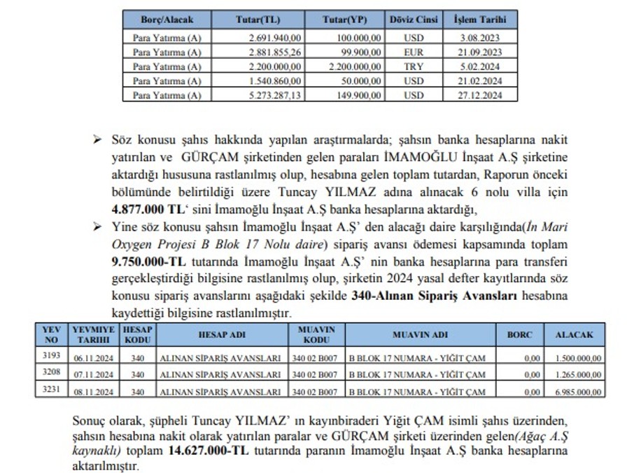 Hazırlanan rapor kapsamında Hazine ve Maliye uzmanları tarafından İmamoğlu İnşaat Anonim Şirketi'nin daire satışları ve hesap hareketleri mercek altına alındı.
