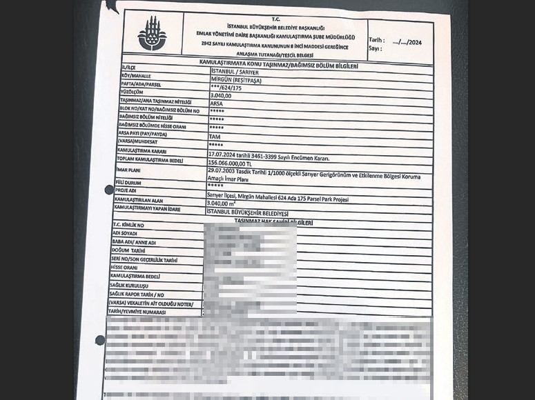 İstanbul'un Sarıyer İlçesi'ndeki Mirgün Mahallesi'nde bulunan ve İBB Başkanı Ekrem İmamoğlu'nun mal varlığı beyanından gizlediği ortaya çıkan 3 adet villasının yanı başında bulunan 3 bin 40 metrekare büyüklüğündeki ağaçlık arsa 11 Temmuz 2024 tarihinde acele encümen kararıyla kamulaştırıldı.
