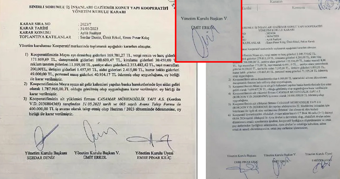 İzmir'deki kooperatif davasında ortaya çıkan ayrıntılar vatandaşın parasının nasıl hortumlandığını gözler önüne serdi. Kooperatiften 29 Nisan 2022'de MDÇ şirketine "400 ton demir ödemesi' adı altında gönderilen 5 milyon 992 bin TL aynı tarihte vadeli hesaba yatırıldı. MDÇ, 05 Mayıs 2022'de bu tutar üzerinden kredi ödemelerini gerçekleştirdi. Kalan 1.5 milyon lira kooperatif başkanı Deniz'in sahibi olduğu şirkete gönderildi. Ayrıca kooperatif tarafından 50 bin liralık işe 850 bin lira ödeme yapıldı. Aradaki 800 bin liralık fark yine Deniz'in şirketine yatırıldı.