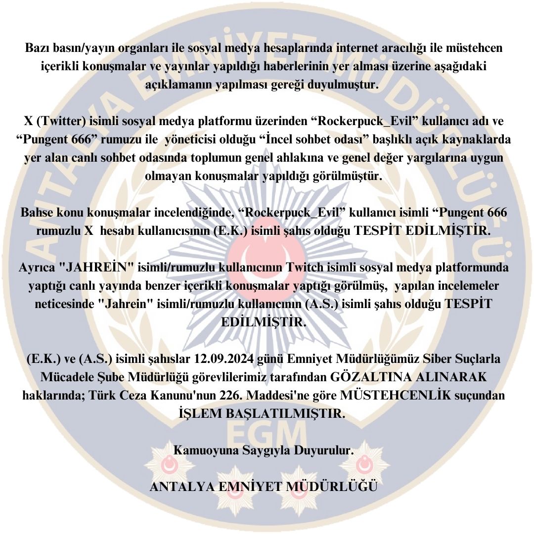 (E.K.) ve (A.S.) isimli şahıslar 12.09.2024 günü Emniyet Müdürlüğümüz Siber Suçlarla Mücadele Şube Müdürlüğü görevlilerimiz tarafından gözaltına alınarak haklarında; Türk Ceza Kanunu'nun 226. Maddesi'ne göre müstehcenlik suçundan işlem başlatılmıştır.