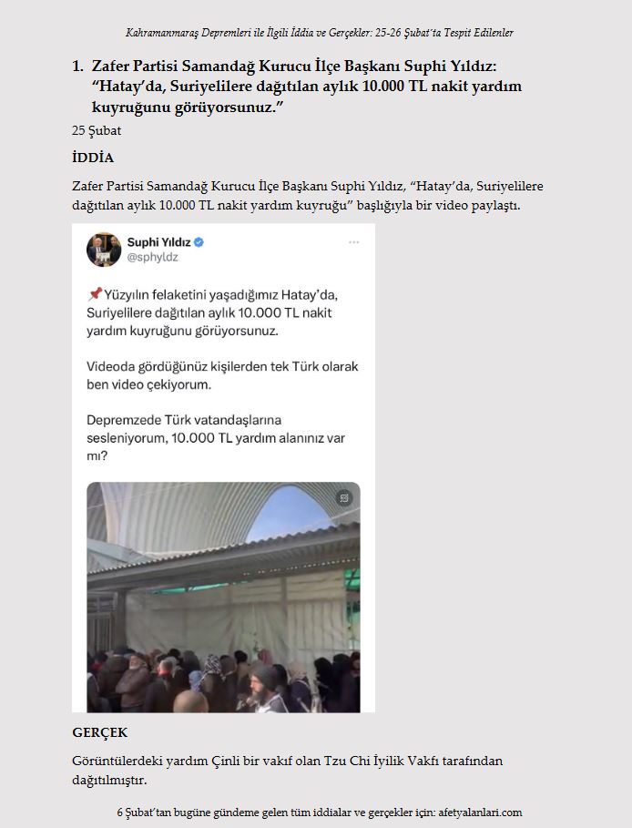 Zafer Partisi Samandağ Kurucu İlçe Başkanı Suphi Yıldız, "Hatay'da, Suriyelilere dağıtılan aylık 10.000 TL nakit yardım kuyruğu" başlığıyla bir video paylaştı.