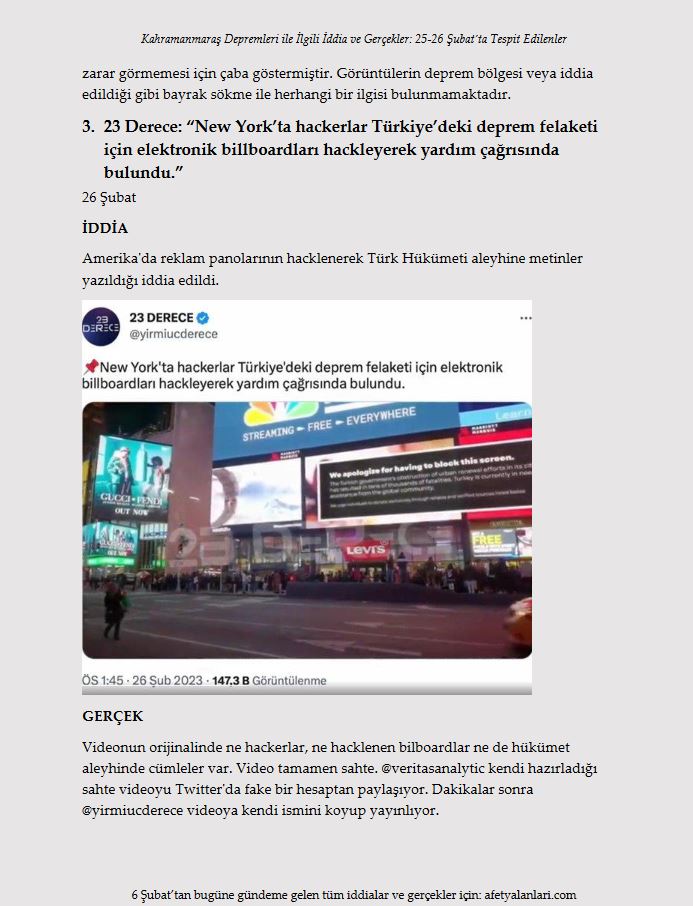 3. 23 Derece: "New York'ta hackerlar Türkiye'deki deprem felaketi için elektronik billboardları hackleyerek yardım çağrısında bulundu."