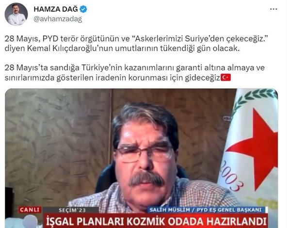 Terörist Salih Müslim, "Sandıkta yenebilirsek bütün intikamları bir kişiden almış oluruz." dedi. AK Parti Genel Başkan Yardımcısı Hamza Dağ ise bu açıklamayla ilgili "28 Mayıs, PYD terör örgütünün ve "Askerlerimizi Suriye'den çekeceğiz." diyen Kemal Kılıçdaroğlu'nun umutlarının tükendiği gün olacak" ifadelerini kullandı.