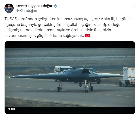 Erdoğan paylaşımında, "TUSAŞ tarafından geliştirilen insansız savaş uçağımız Anka III, bugün ilk uçuşunu başarıyla gerçekleştirdi.