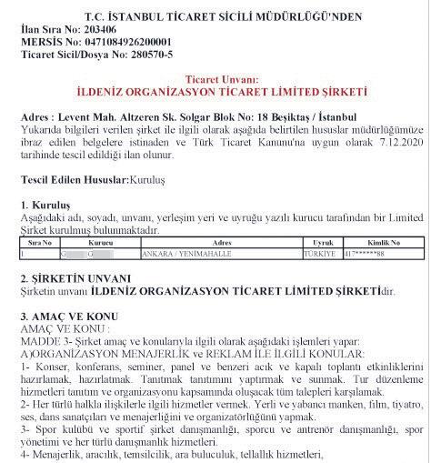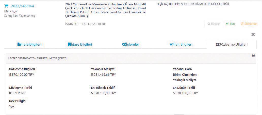 Sevgili G.G. üzerine kurulan şirkete yönelik yapılan araştırmalarda kayıt numaraları ve bedelleri; 2022/1465164 (5 milyon 870 bin 100 TL), 2022/240749 (710 bin 650 TL) ve 2024/400881 (7 milyon 200 bin 200 TL) olan 3 ayrı organizasyon ve muhtelif mal ve hizmet alımı kapsamında şirketin Beşiktaş Belediyesi'nden 3 ayrı ihale aldığı ve bu ihalelerin toplam bedellerinin 13 milyon 780 bin TL olduğu görüldü. 17 Ocak 2023 tarihli ihalede, "2023 yılı temsili ve törenlerde kullanılmak üzere muhtelif çiçek ve çelenk hazırlanması ve teslim edilmesi, Kovid- 19 hijyen paketi, kız ve erkek çocuklar için oyuncak ve çikolata alımı işi" karşılığında İldeniz Organizasyon'a 5 milyon 870 bin 100 lira ödeme yapıldı. 18 Nisan 2024 tarihli ihalede ise yine aynı mal alımı karşılığında 7 milyon 200 bin 200 TL ödeme alındı. 18 Mart 2022'deki ihalede de benzer hizmetler karşılığında Beşiktaş Belediyesi'nden 710 bin 650 TL alındı.