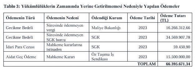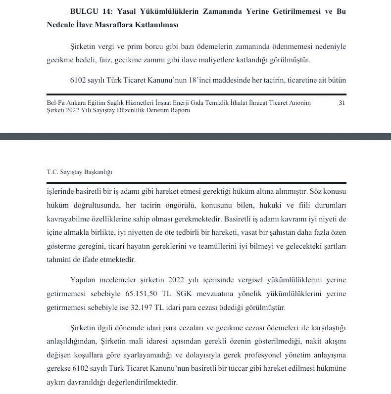 Raporlara göre; BEL-PA, PORTAŞ, BUGSAŞ'da çalışan işçiler için ayrılması gereken kıdem tazminatı karşılıklarının ayrılmadığı görülmüştü. BELPA'nın'da yüksek miktarda vergi ve SGK borcu olduğu, geciken bu borçlar nedeniyle şirkete bir de yüksek miktarda gecikme zammı ve faiz gibi ilave maliyetler çıktığına değinilmiş, PORTAŞ'ında, şirketin yükümlülüklerinin zamanında yerine getirilmemesi nedeniyle yüksek miktarda gecikme cezası ve idari para cezası ödediği yer almıştı.