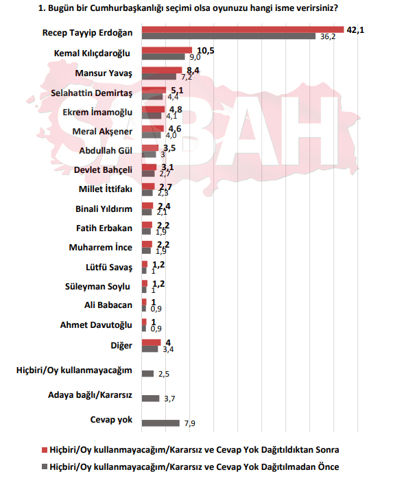 Seçim anketinin en çarpıcı sonucu aday olması beklenen isimlerin oy oranları ve bu isimlerin aralarındaki fark. Aday ismi ile yapılan anketlere göre "Bugün bir Cumhurbaşkanlığı seçimi olsa oyunuzu hangi isme verirsiniz?" sorusuna yüzde 42,1 gibi ezici bir oranla Başkan Recep Tayyip Erdoğan cevabı verilirken Erdoğan'ın en yakın takipçisi olan Kemal Kılıçdaroğlu'nu neredeyse 4'e katladığı görüldü. Kılıçdaroğlu'nu tercih edenlerin oranı 10,5'te kaldı.