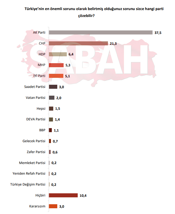 Son seçim anketindeki diğer bir soru ise çıkacak adayı yalnızca partilerin belirlemesi durumunda vatandaşın kime güveneceğini irdeledi. "Hangi partini adayını seçerdiniz?" sorusunun cevabı da AK Parti oldu.
