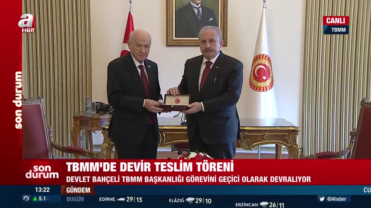 TBMM Başkanı Mustafa Şentop, 23'inci dönemin ilk gününde MHP Genel Başkanı Devlet Bahçeli'ye görevini devretti.