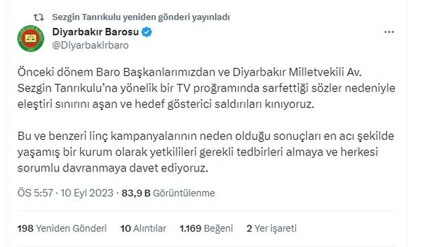 HDP çizgisine yakın olan Sezgin Tanrıkulu'na destek ise Diyarbakır Barosu'ndan geldi. Diyarbakır Barosu sosyal medyadan yaptığı açıklamasında "Önceki dönem Baro Başkanlarımızdan ve Diyarbakır Milletvekili Av. Sezgin Tanrıkulu'na yönelik bir TV programında sarf ettiği sözler nedeniyle eleştiri sınırını aşan ve hedef gösterici saldırıları kınıyoruz. Bu ve benzeri linç kampanyalarının neden olduğu sonuçları en acı şekilde yaşamış bir kurum olarak yetkilileri gerekli tedbirleri almaya ve herkesi sorumlu davranmaya davet ediyoruz" şeklinde yazdı.